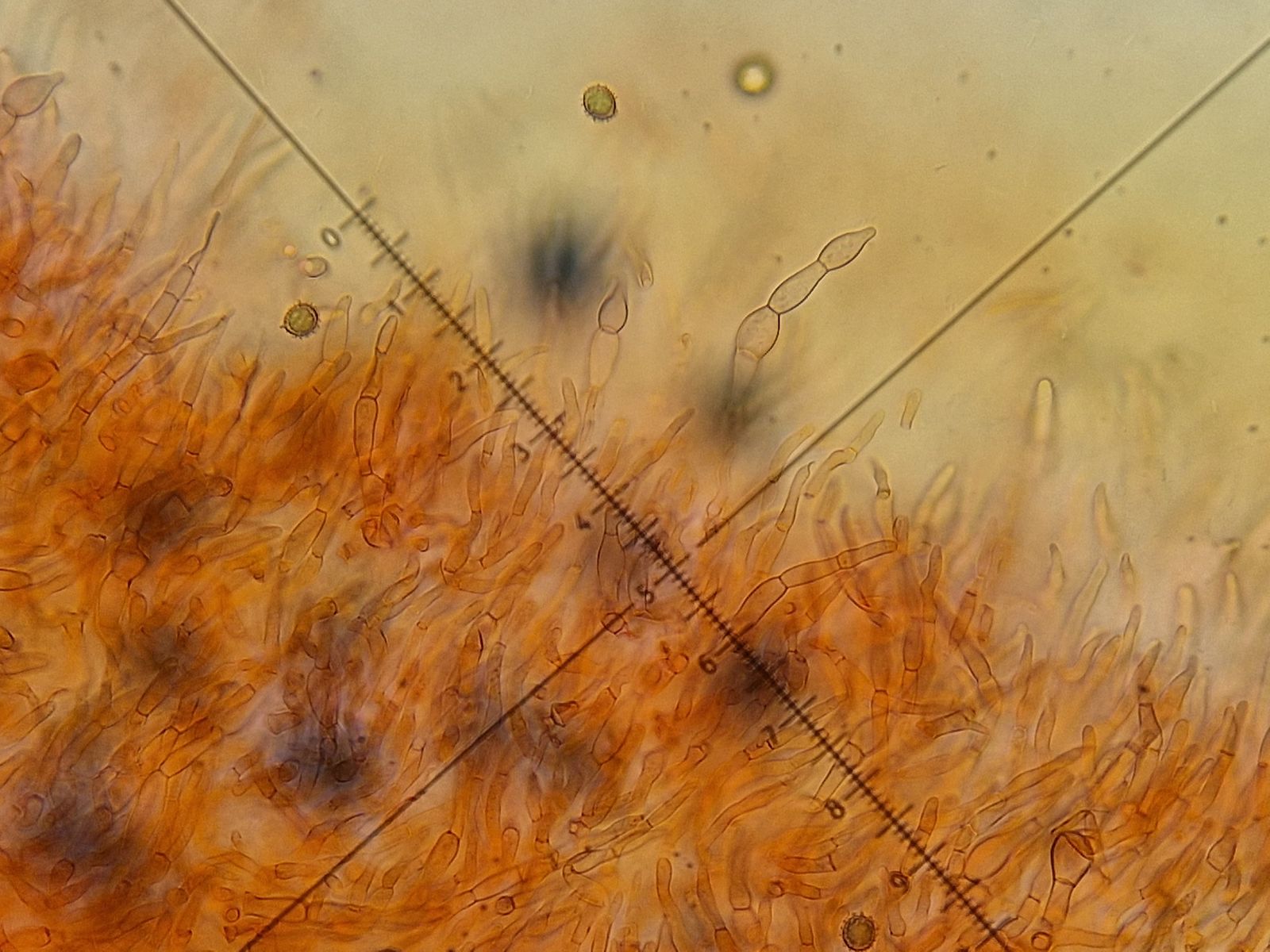 Optik vom Pilz passt, Phenol passt, HDS mit kurz septierten und blasigen Haaren passt auch und die gelblichen Lamellen lassen schon ein dunkleres SpP erahnen.Das passt 1:1 ...