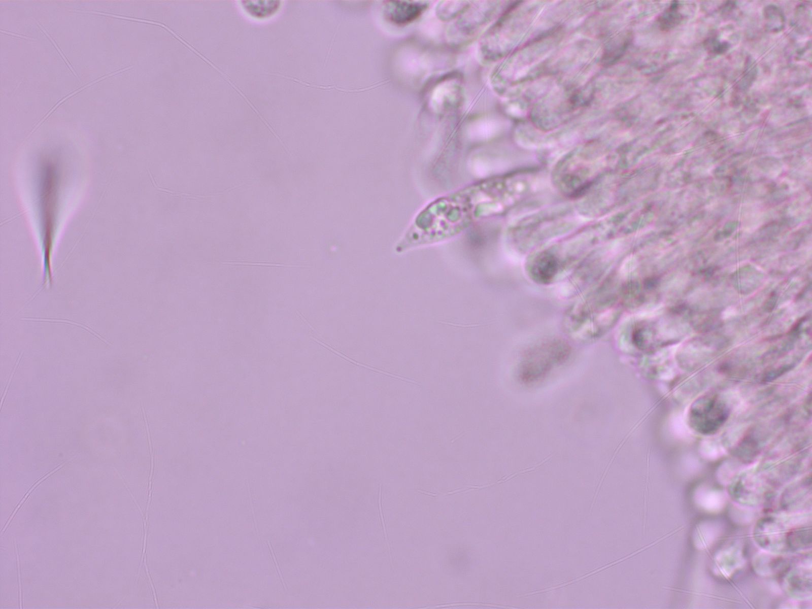 Spindelige Pleurozystiden sind vorhanden, aber nur ganz wenige, vielleicht fünf pro Lamellenschnitt.