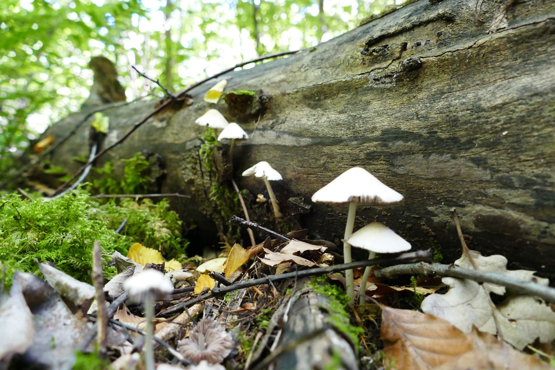 Die Pilze wuchsen im Wald längs eines gestürtzten Baumstammes.