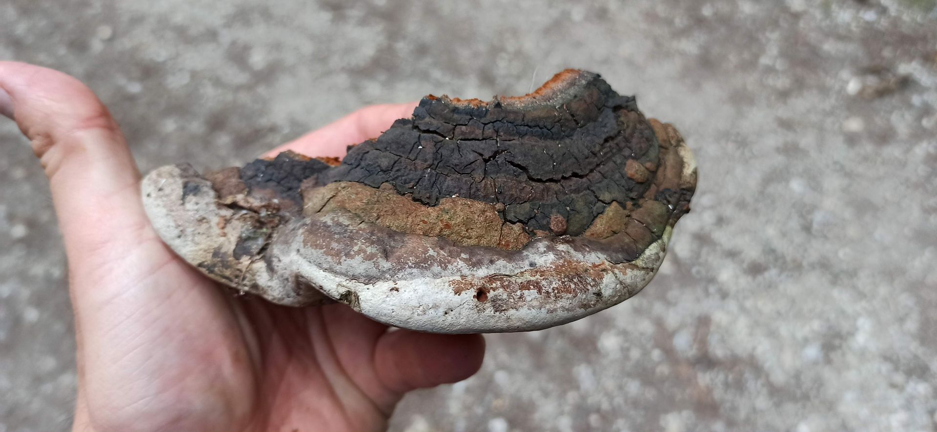 Habe ich an totem Laubbaum (unbekannt) einen gemeinen Feuerschwamm gefunden? Hutmitte dunkel rissig, wirkt wie Borke, Zuwachsstelle grau, Poren sehr fein/viele, dunkles Rostbraun, Anwachsstelle gleiche Farbe wie Röhren, weiße fast silbrig glänzende Myzelsträhnen. Was denkt ihr? LG Wastl