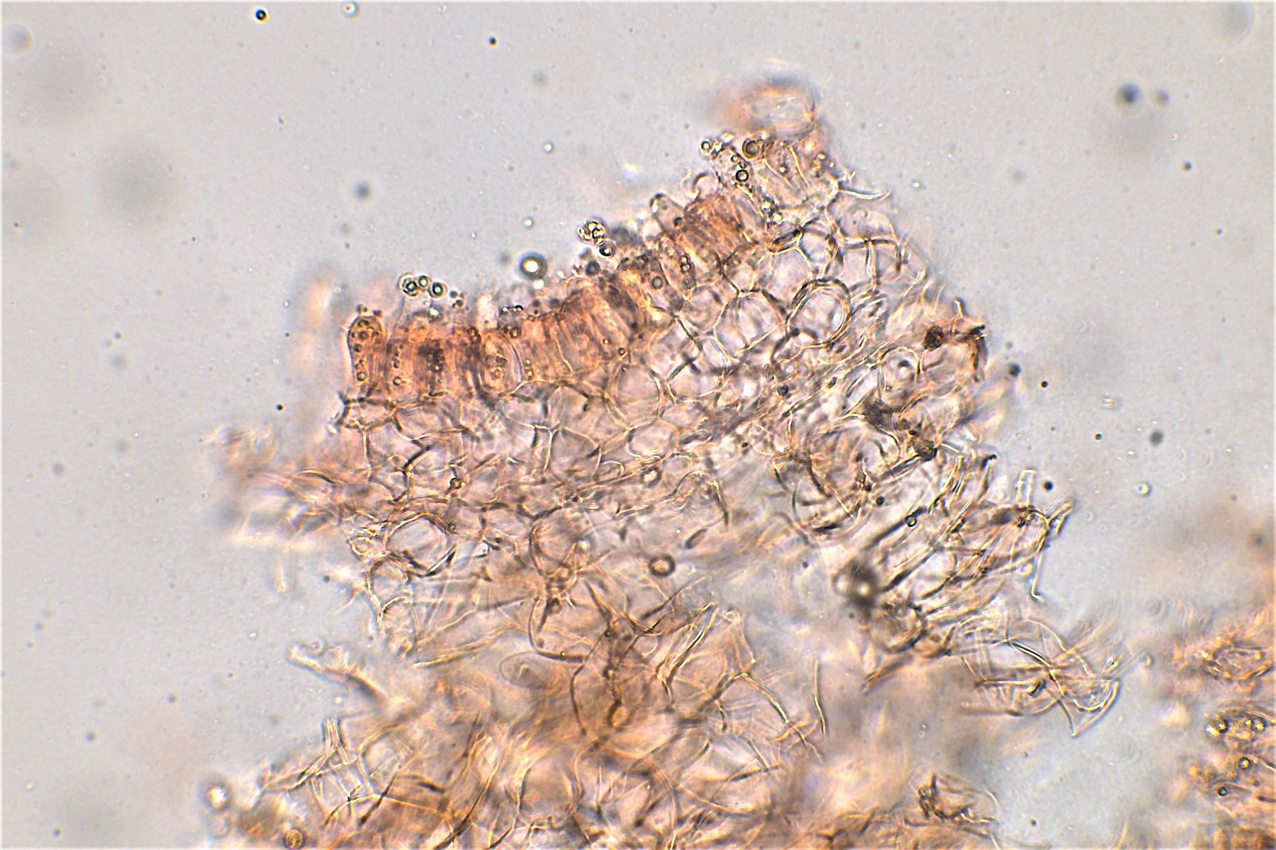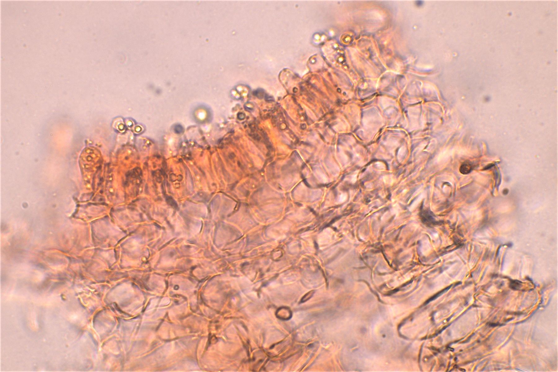 Aufsicht Hymenium mit 4 sporigen Basidien und Cheilozystiden