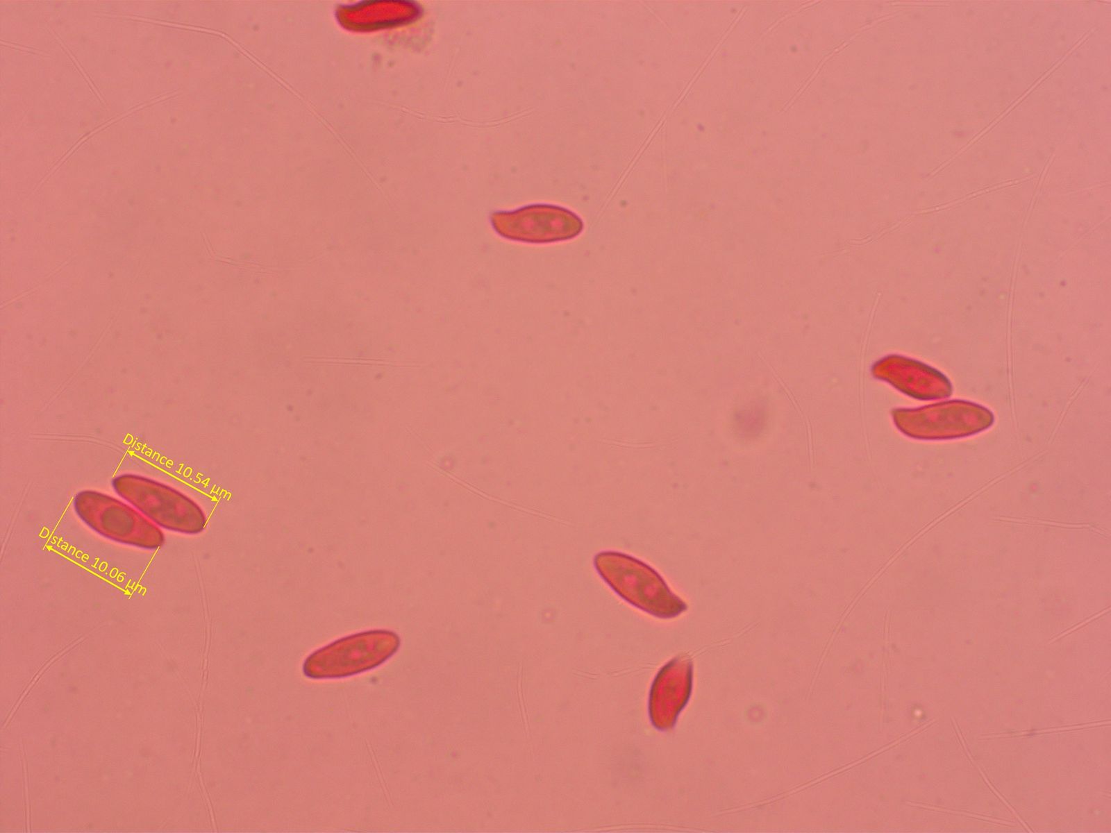 Dextrinoid, länglich-boletoid, etwa 9-11 x 3-4.5 µm.