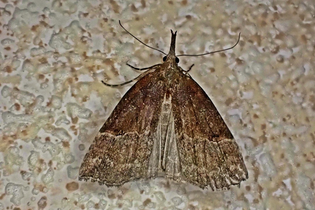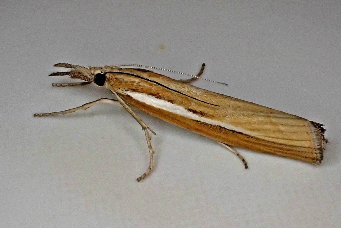 Dann landete dieser Zünsler (Agriphila tristella) in unserer Küche auf den Fliesen über der Spüle. Größe ca. 1,5 cm.