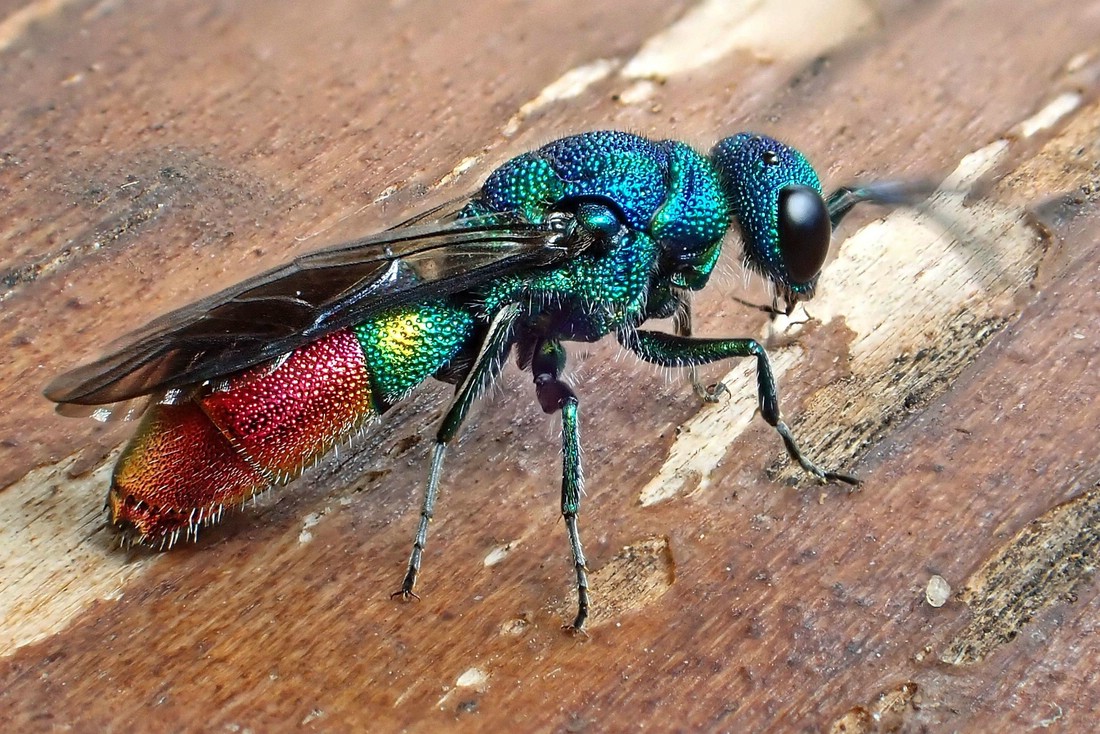 Die nur 1 cm große Blaugrünrote Goldwespe (Chrysis fulgida). Die Fühler waren in ständiger Bewegung, also leider nicht gut abbildbar.