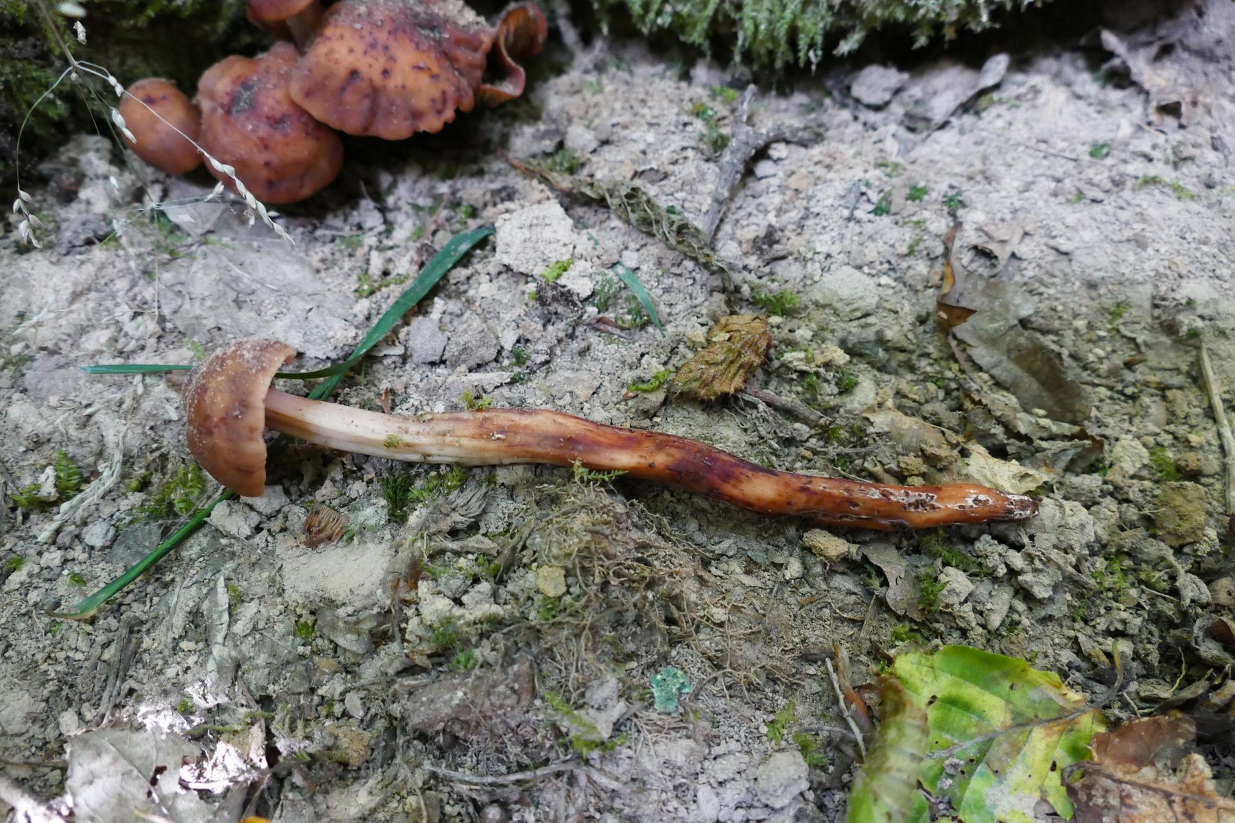 Gleich zu Begin des Weges, unter Lärchen, lassen sich an mehreren Stellen Kiefern-Braunporlinge finden, teilweise schöne, ganz junge Expemplare.
