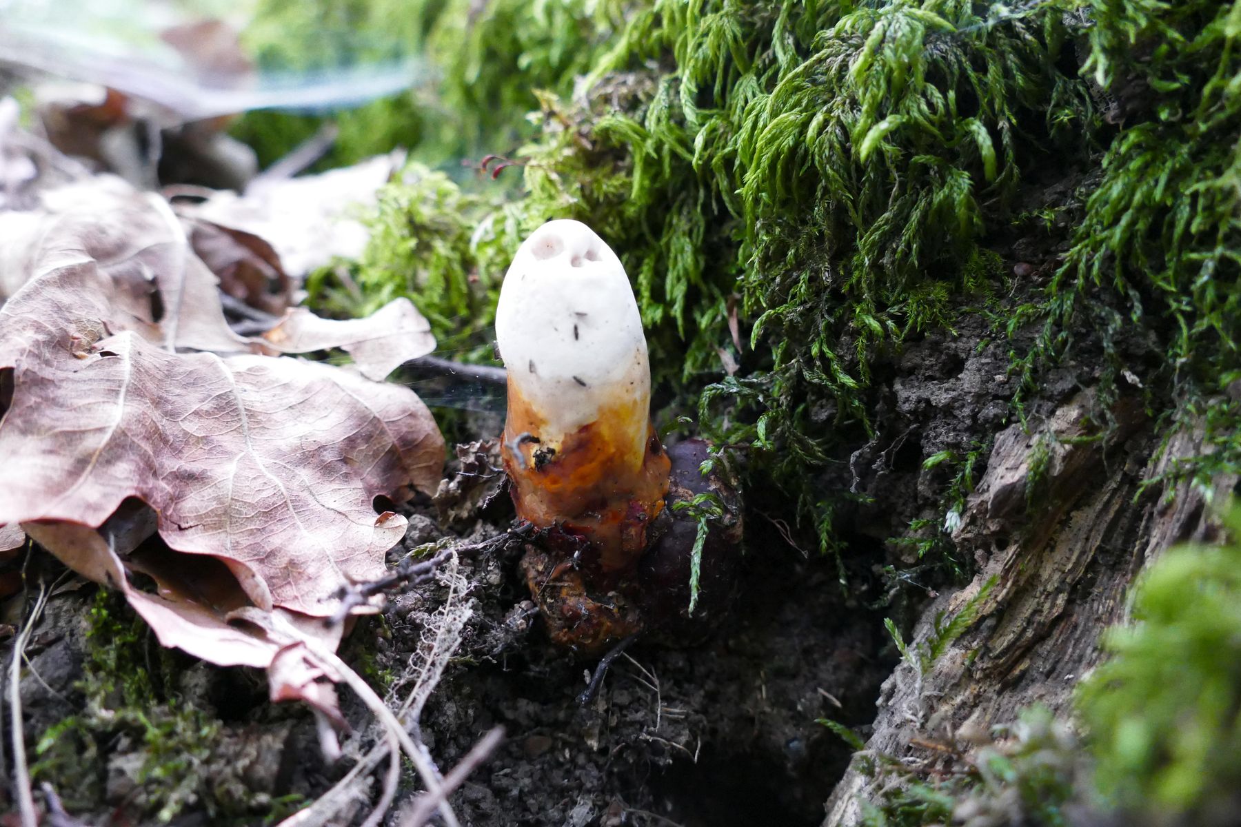Am Baumstumpf daneben etwas, was ich für eine aus dem Hexernei schlüpfende Stinkmorchel halten könnte, noch ohne Gleba: