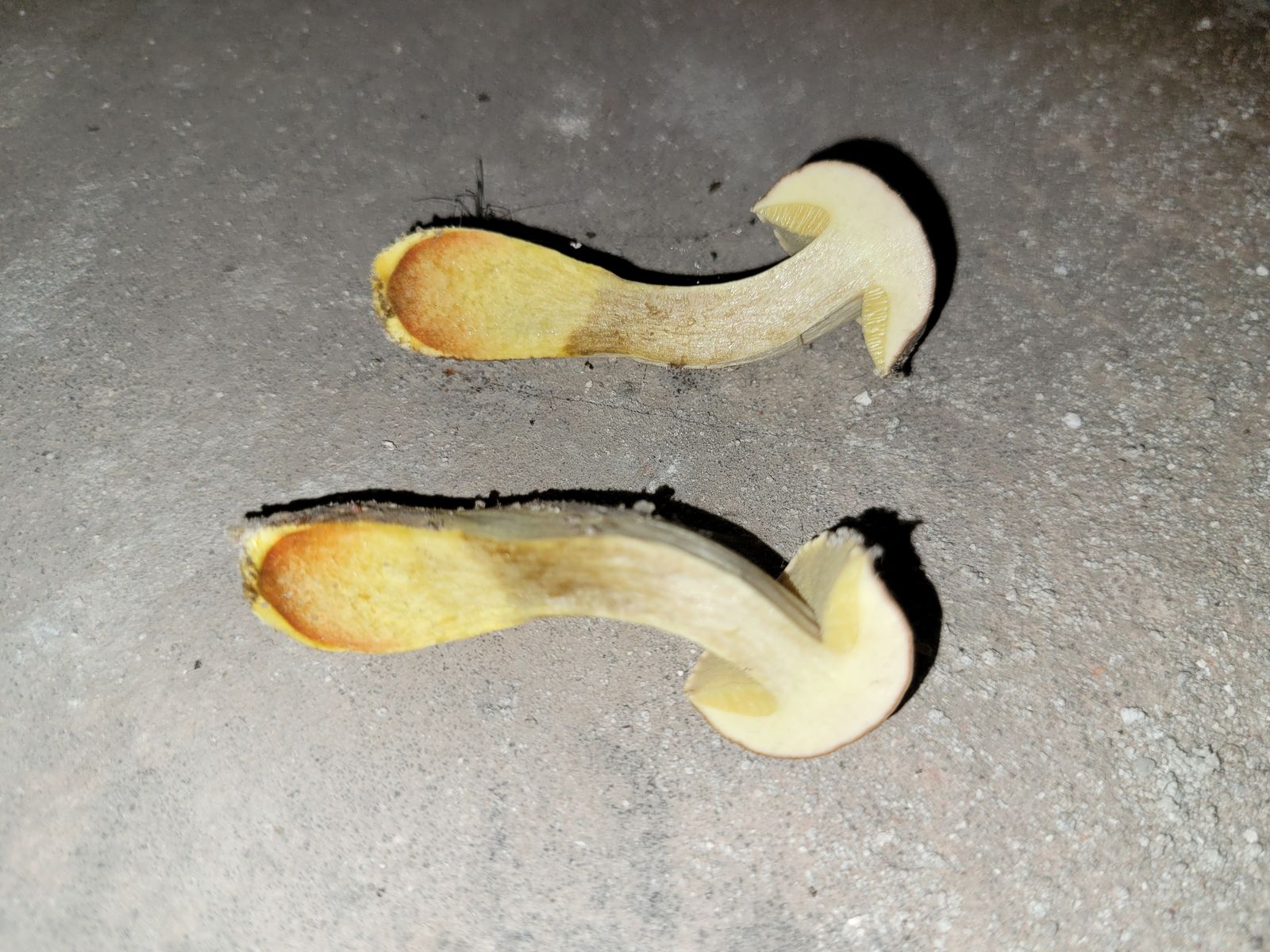 wichtig wäre noch, dass du nach 15 Minuten nochmal Fotos von den Schnitten machst, um blaue Verfärbung zu erkennen. Die brauchen manchmal eine Weile. Die Stielbasis ist ja ziemlich orange. Vielleicht ist es Hortiboletus engelii, aber diese bräunlichen und rötlichen Verfärbung im Fleisch weiter oben passen da weniger gut zu, glaube ich.