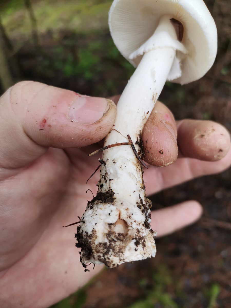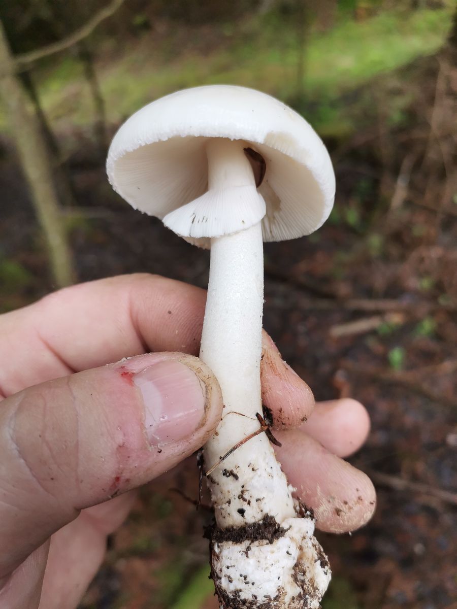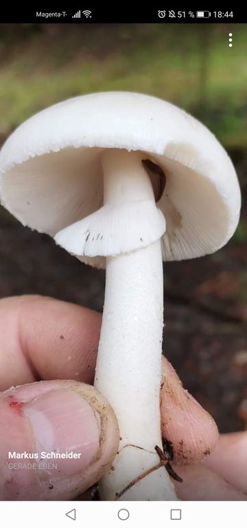 Wo ist denn das? Das könnte von der Statur und Stieloberfläche auch Amanita verna sein, hast du KOH? Amanita verna reagiert gelb, Amanita phalloides var alba negativ.