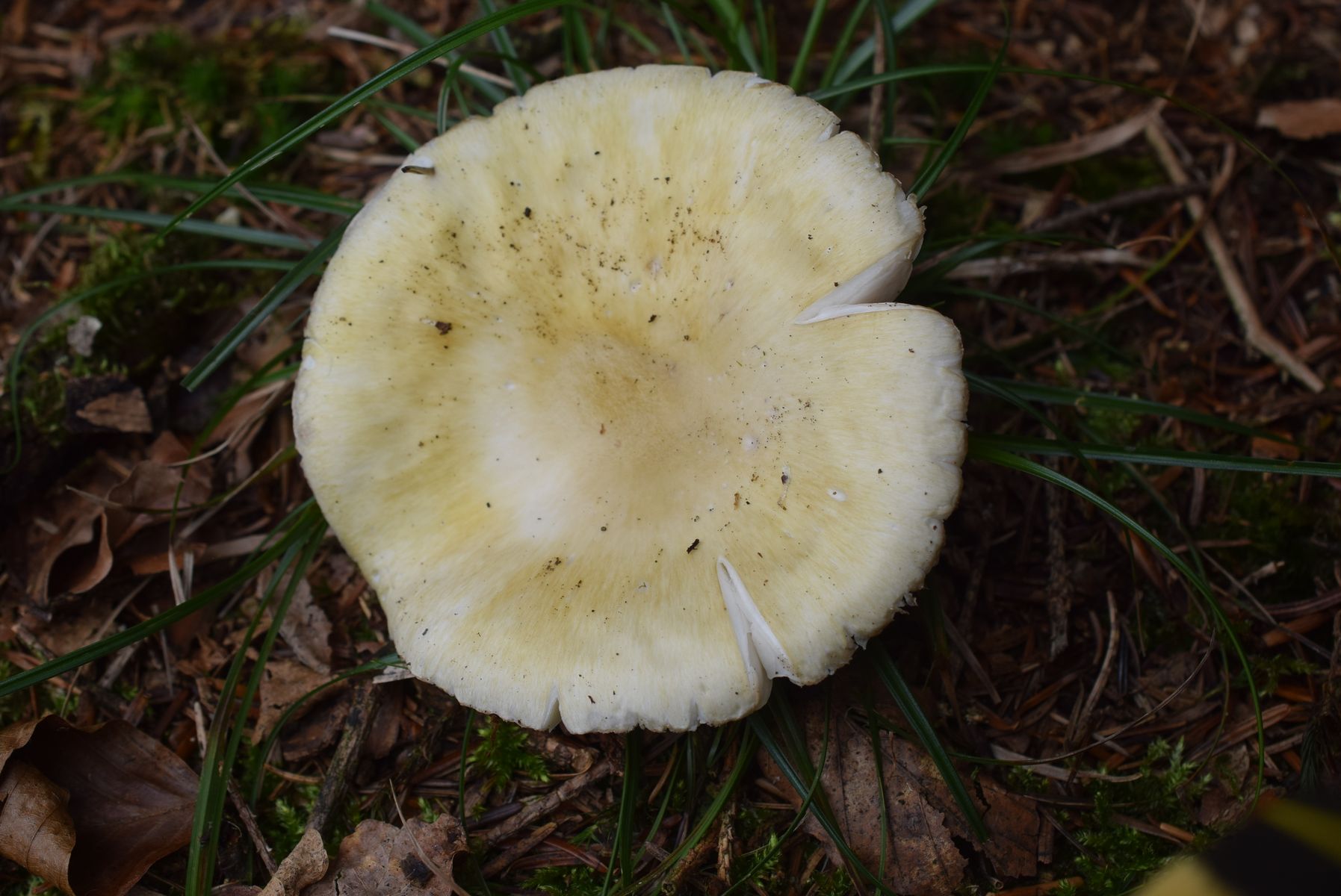 Der Pfeil zeigt auf eine schwach ausgeprägte, aber deutlich erkennbare Volva. Verglichen mit der linken Hälfte der 123 Aufnahme ist Amanita phalloides var. alba daher ein guter Kandidat.