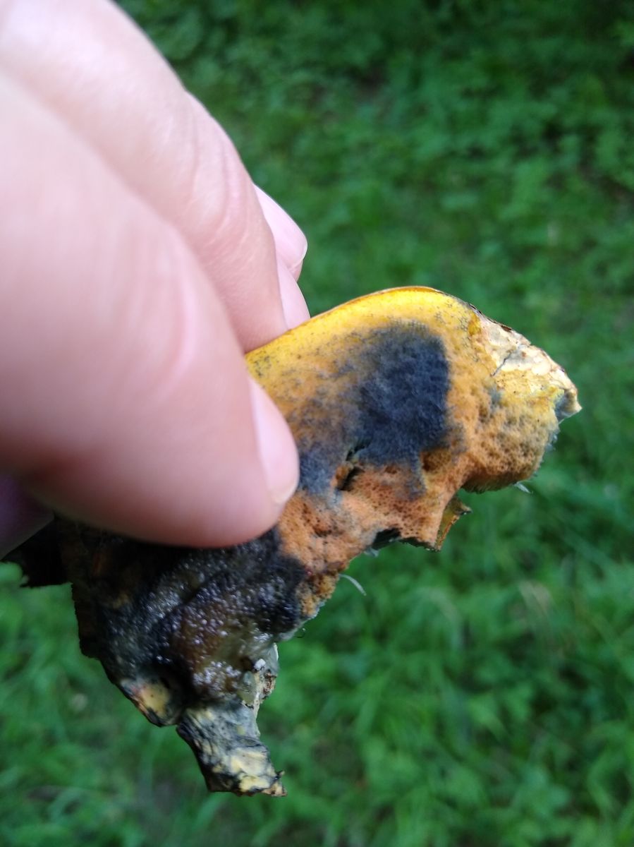 Poren außen gelb, innen orange-rot; schnell und stark blauend