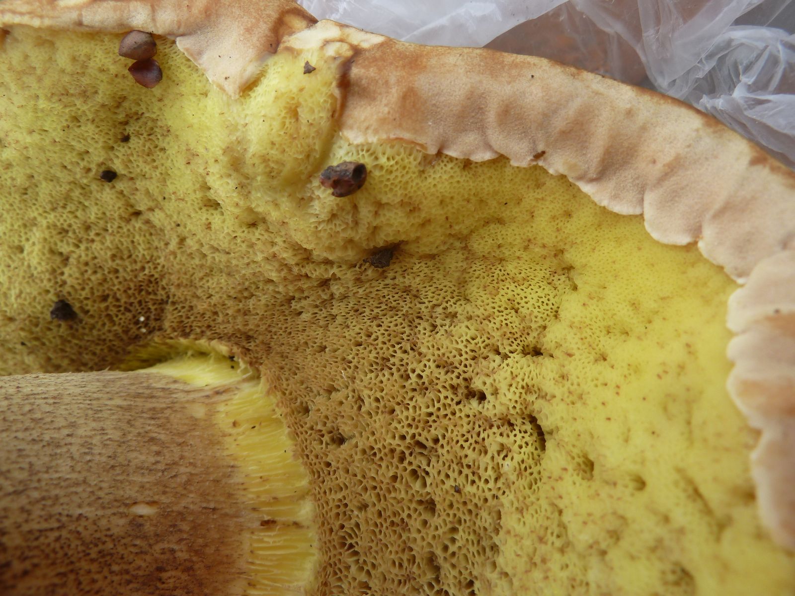 Deutlicher Jodgeruch, besonders in der Stielbasis, erinnert etwas an Riesenbovist oder Karbol-Champignon. Geschmack schwach säuerlich (ähnlich Rotfußröhrling). Soweit passt das alles. Alleine die ausgeprägte Stielschuppung (wie beim Birkenpilz) irritiert mich etwas, gibt es noch irgendwelche Verwechslungsmöglichkeiten?