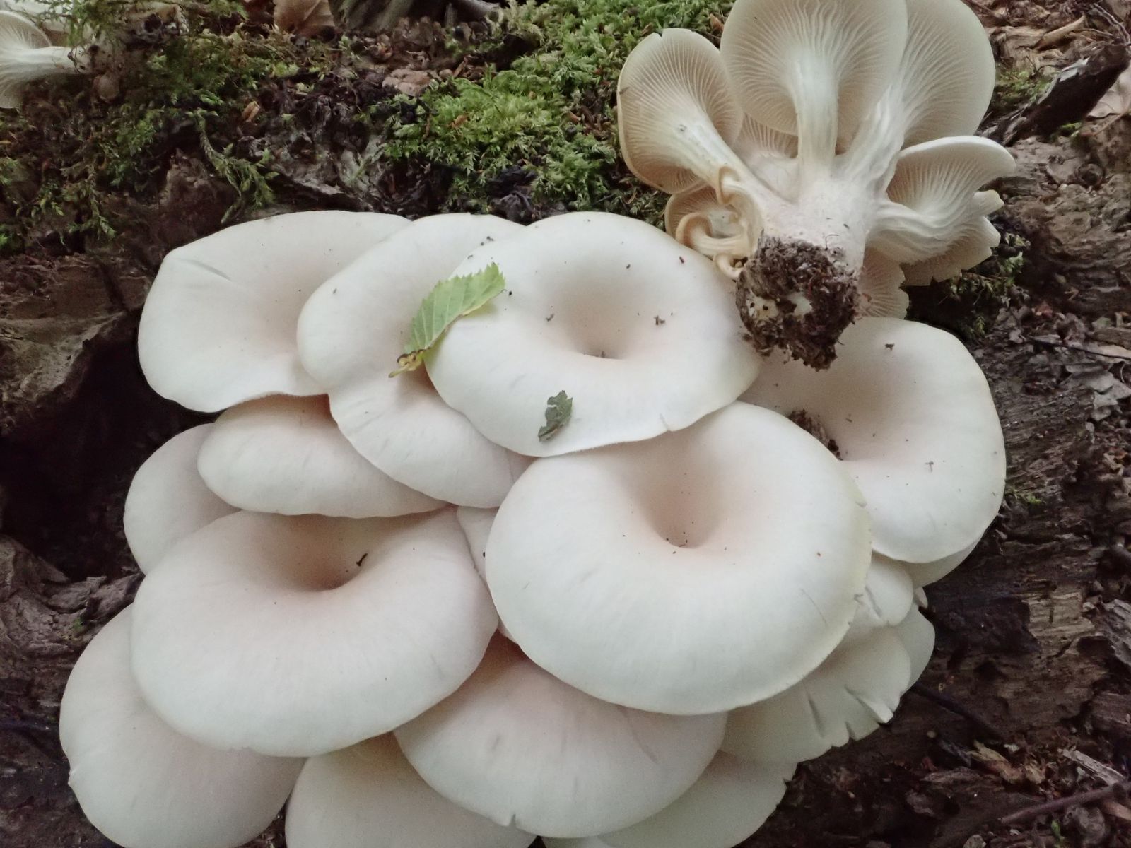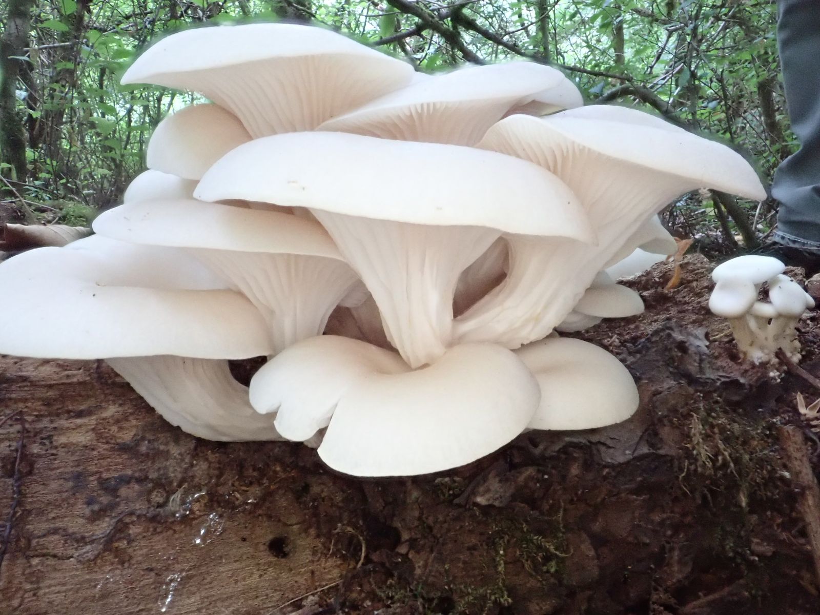 Dann fand ich auf liegenden Ulmus?-Stämmen endlich mal wieder den Rillstieligen Seitling, Pleurotus cornucopiae. Er ist in den letzten Jahren bei uns selten geworden (wegen des Ulmen-Sterbens), d.h. zumindest haben wir ihn selten gefunden, er kommt ja auch auf anderen Laubhölzern vor.