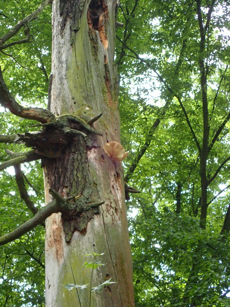 An einem stehenden, toten Laubholzstamm entdeckten wir in ca. 4 m Höhe einen Blätterpilz, den wir als Hypsizygus ulmarius, Ulmen-Rasling bezeichnen würden. Der kommt nicht nur an Ulme vor. Wir denken, dass der Stamm eine Eiche war. Leider hatten wir keine lange Leiter dabei um den Fruchtkörper zu ernten, deshalb ist das Belegfoto nur eine Vermutung.