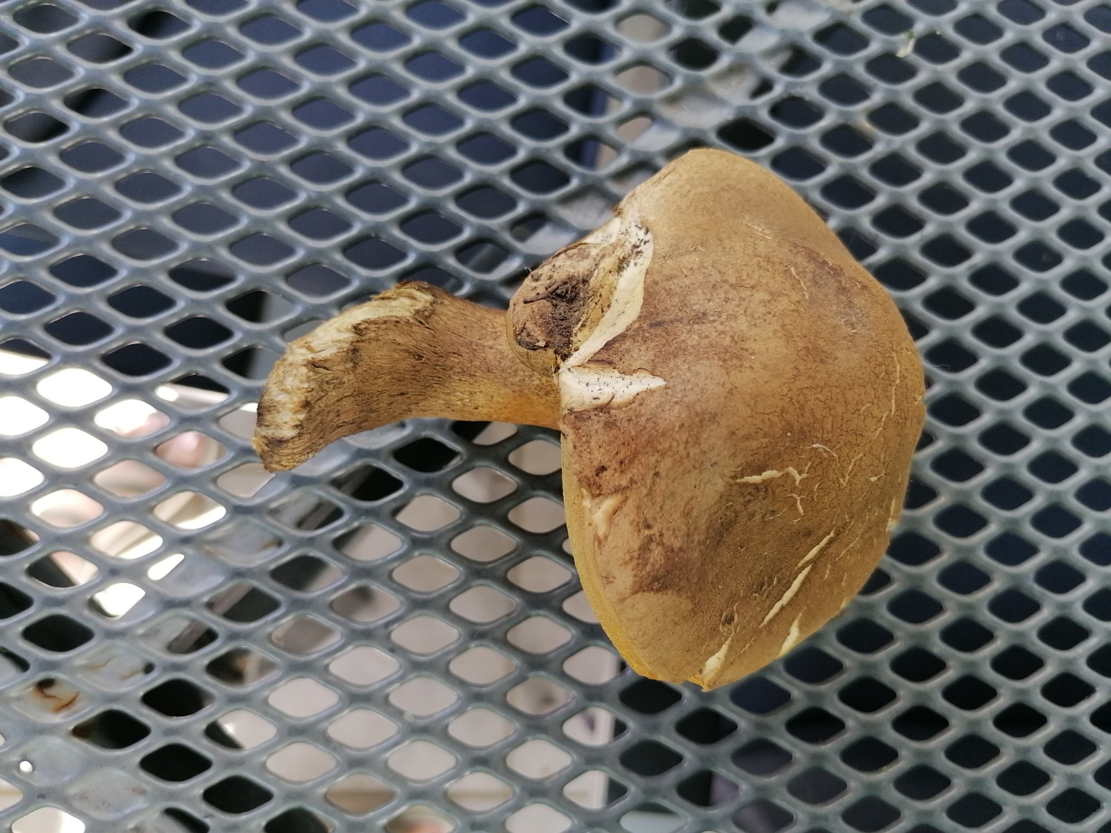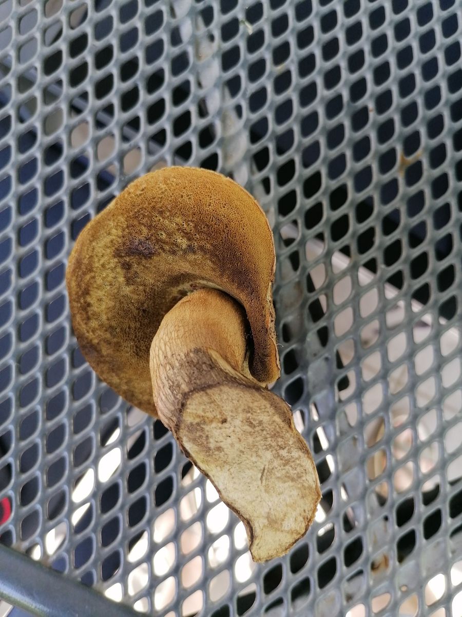 Bei dem zweiten Fund (heute) handelt es sich meines Erachtens nach um den gleichen Pilz (anderer Fundort, ähnliches Habitat), aber wohl älter, die Röhren sind dunkelgelb-bräunlich-olivfarben. Einzelexemplar. Er zeigt ein deutliches Netz in Hutfarbe auf hellerem Grund.