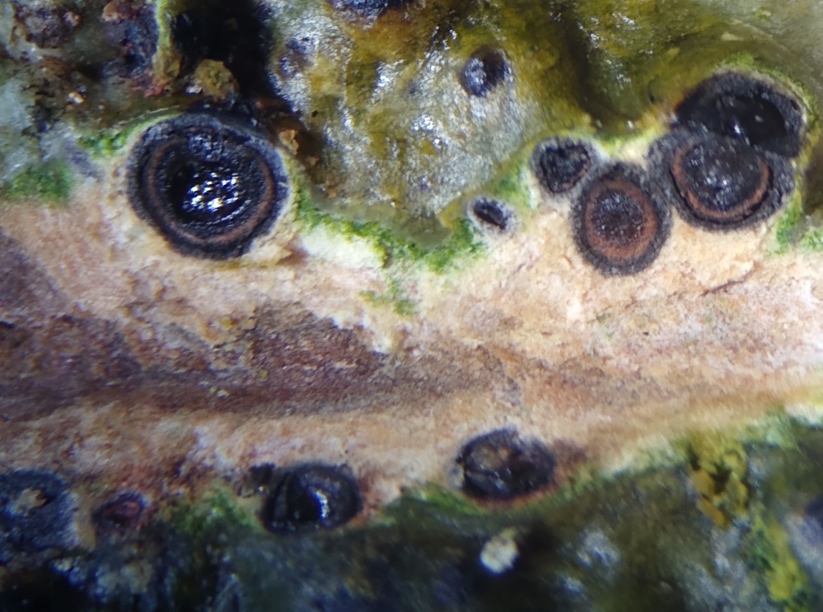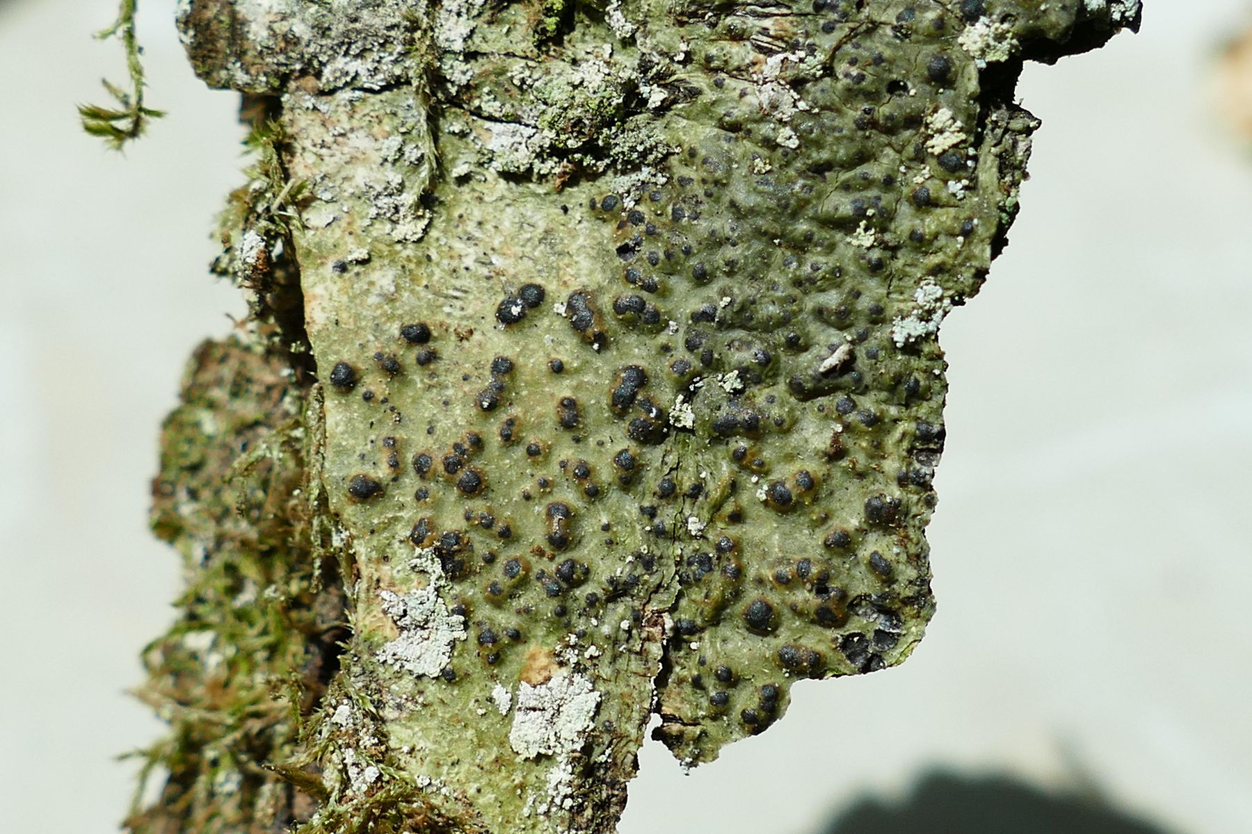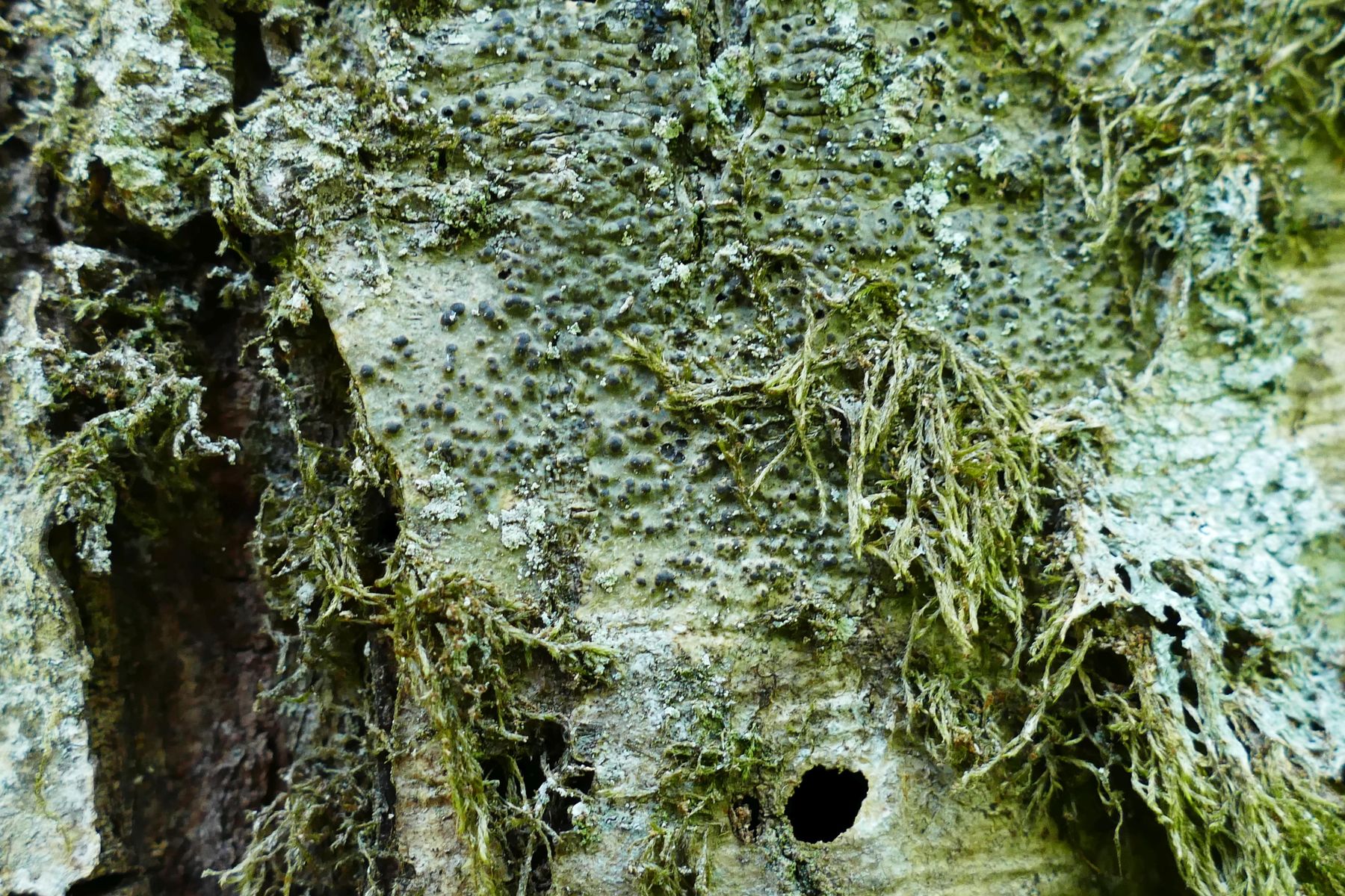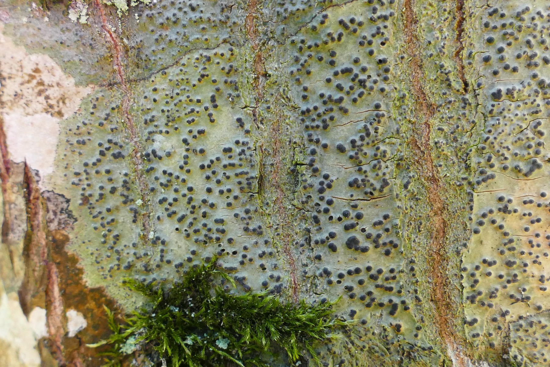 Ein Stück weiter, beim Kontrollieren eines Hainbuchenstamms fallen mir im Kopfhöhe oliv-braune Krustenflechten mit großen, schwarzbraunen Perithecien auf.