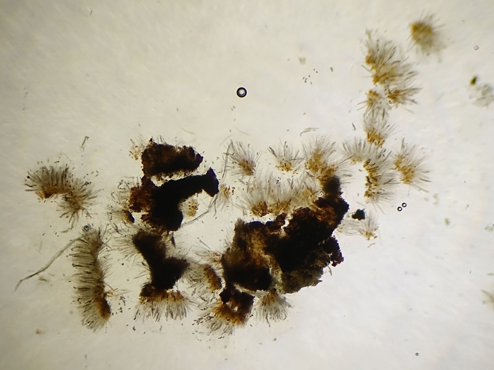 Das Hymenium mit Excipulum lässt sich mit dem Zahnarztbesteck leicht aus dem festen Involucrellum lösen und unter das Mikroskop verfrachten.