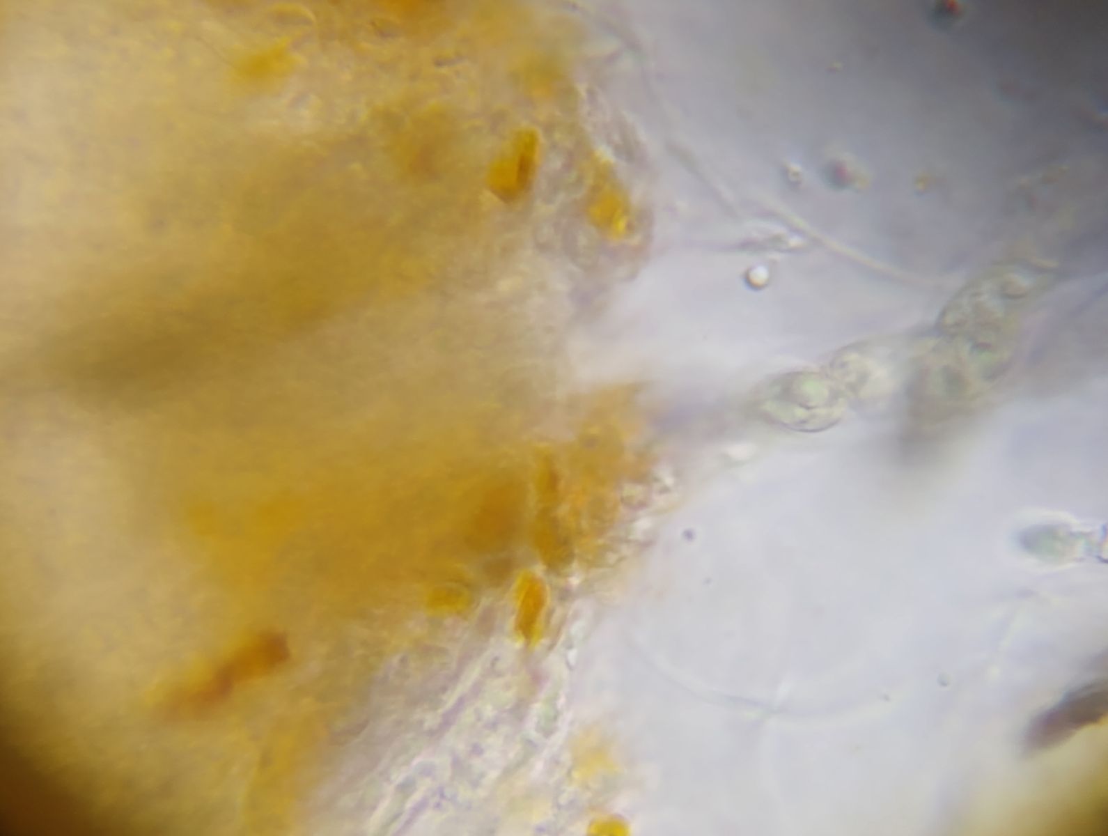 Bild 9 Hymeniumbereich mit leuchtend gelben Pigment (verfärbt sich während der Untersuchung langsam nach rot)