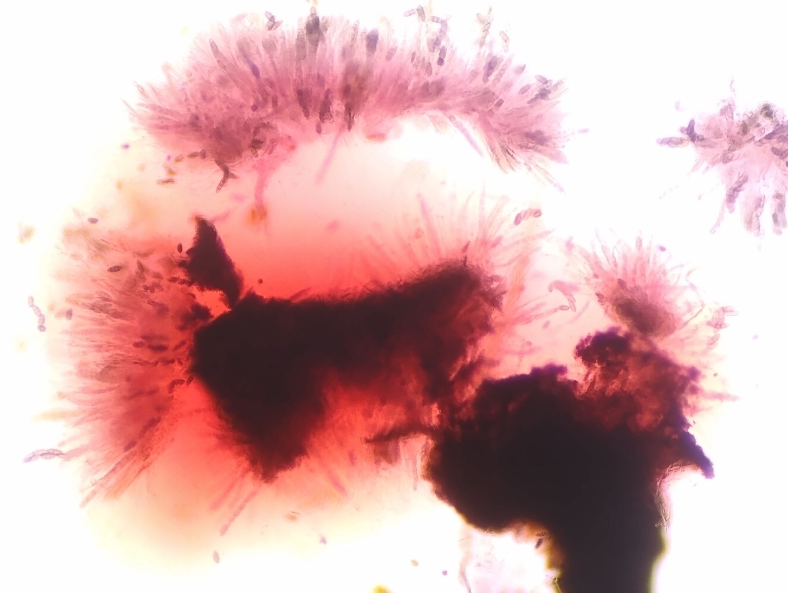 Bei Zugabe von KOH unter das Deckglas verfärbt sich die Umgebung um das Excipulum schnell tiefrot: