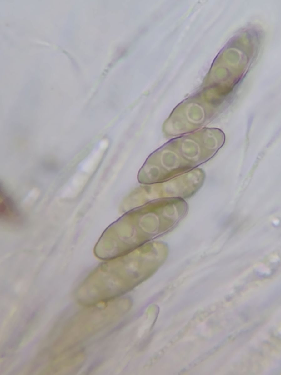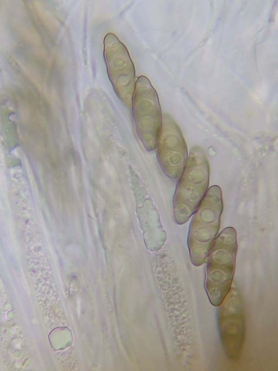 Die glatten Sporen sind spindelförmig, vierzellig und braun - erinnern ein wenig an das Michelin-Männchen.