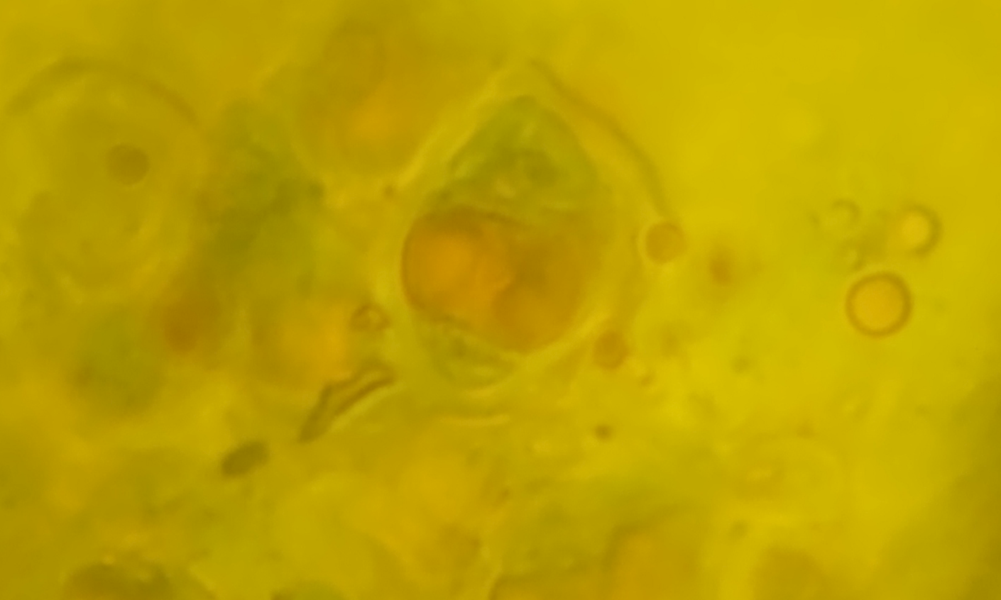Im Mikroskop (Wasser) sind unterhalb der Asci ein gelbes Exsudat erkennbar: