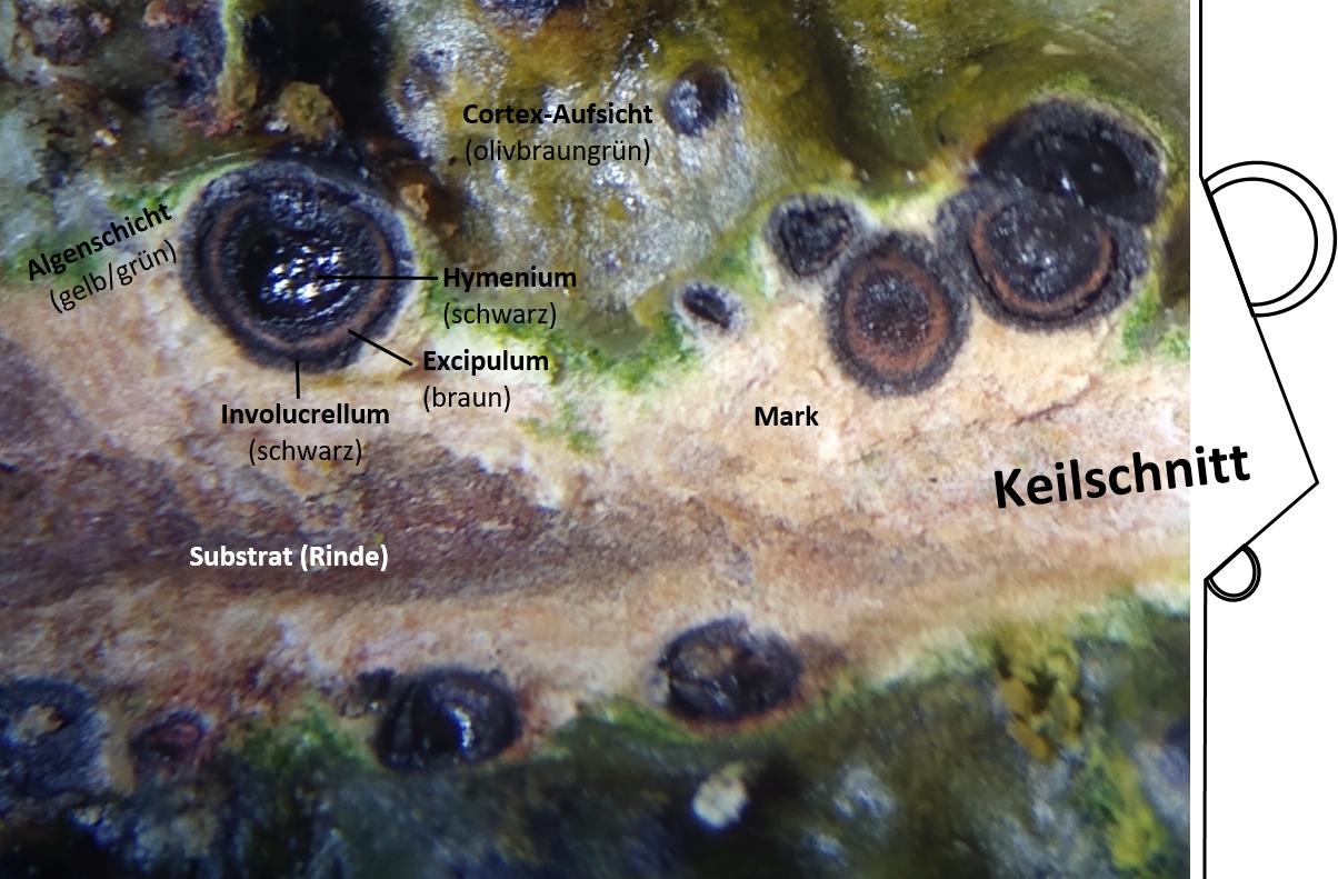 Ein Keilschnitt in den Thallus zeigt dessen Aufbau.