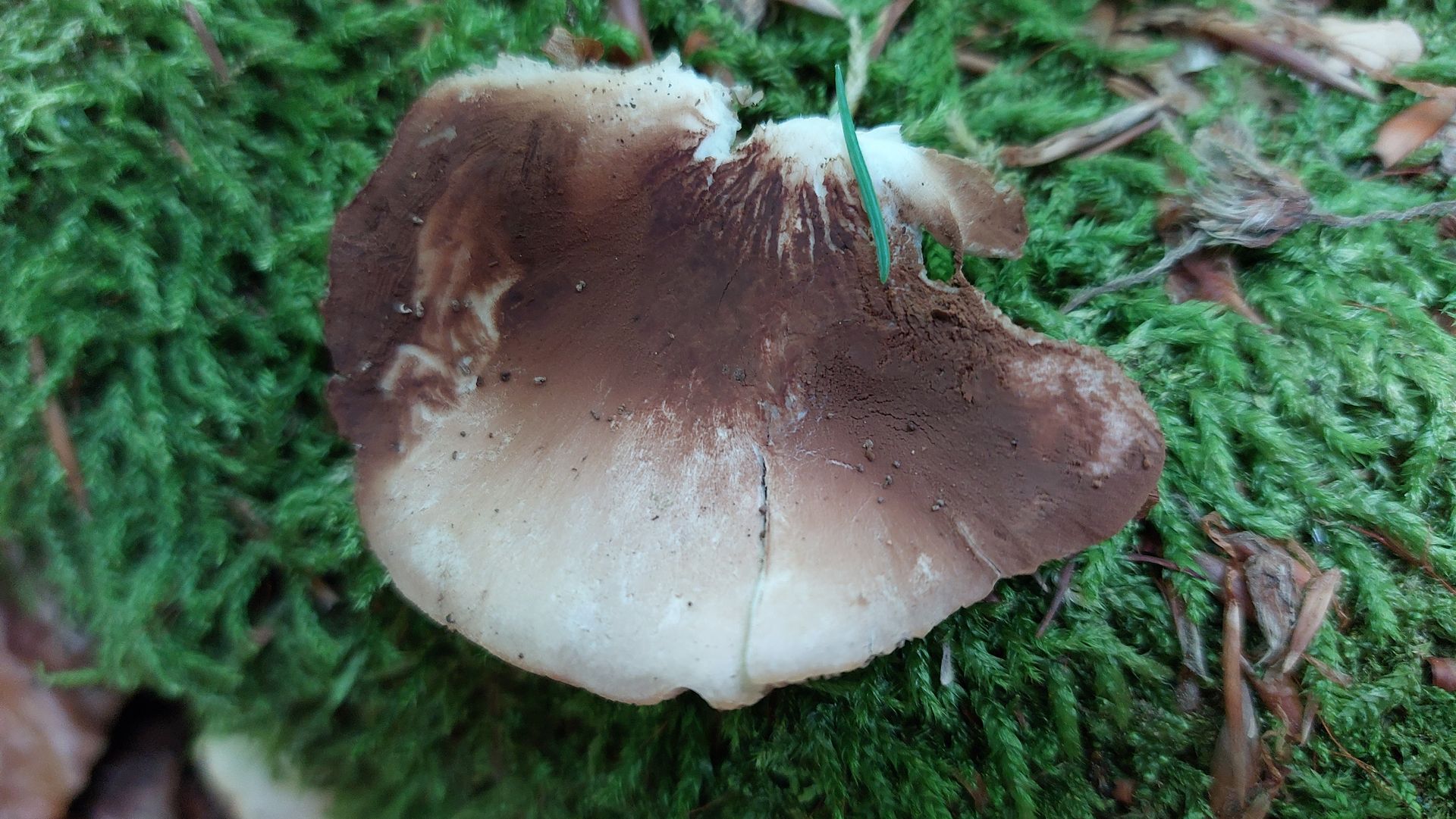 Aufgrund des Sporenpulvers der darüber wachsenden Fruchtkörper ist dieser im hinteren Bereich braun eingefärbt.