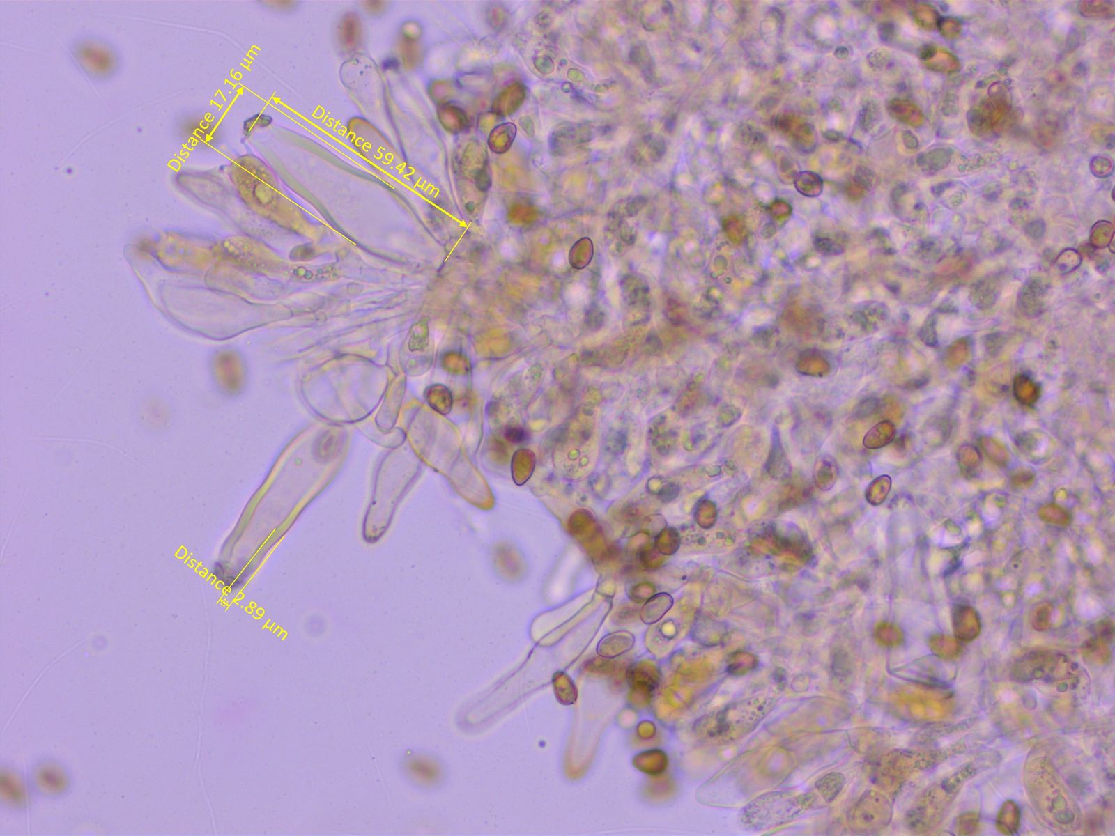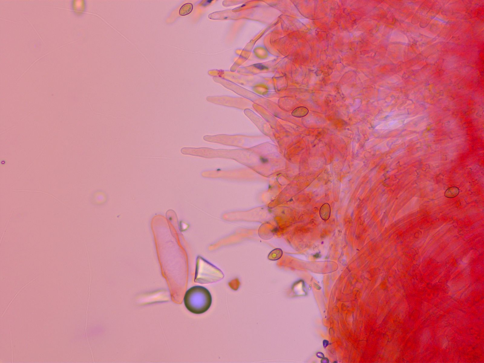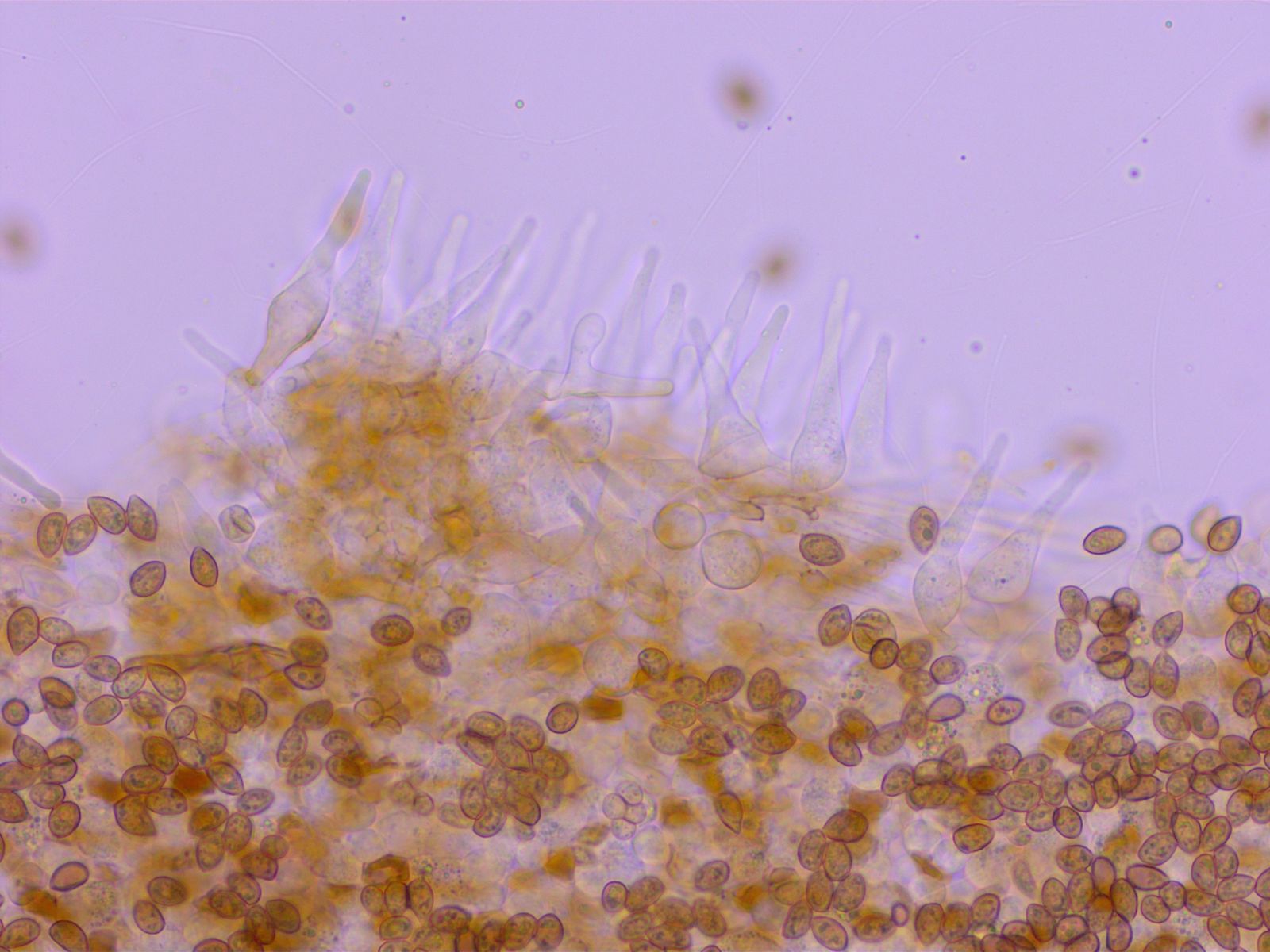 Pleurozystiden viel regelmässiger, mit schlankem Stiel und dicken Wänden.