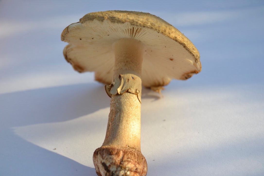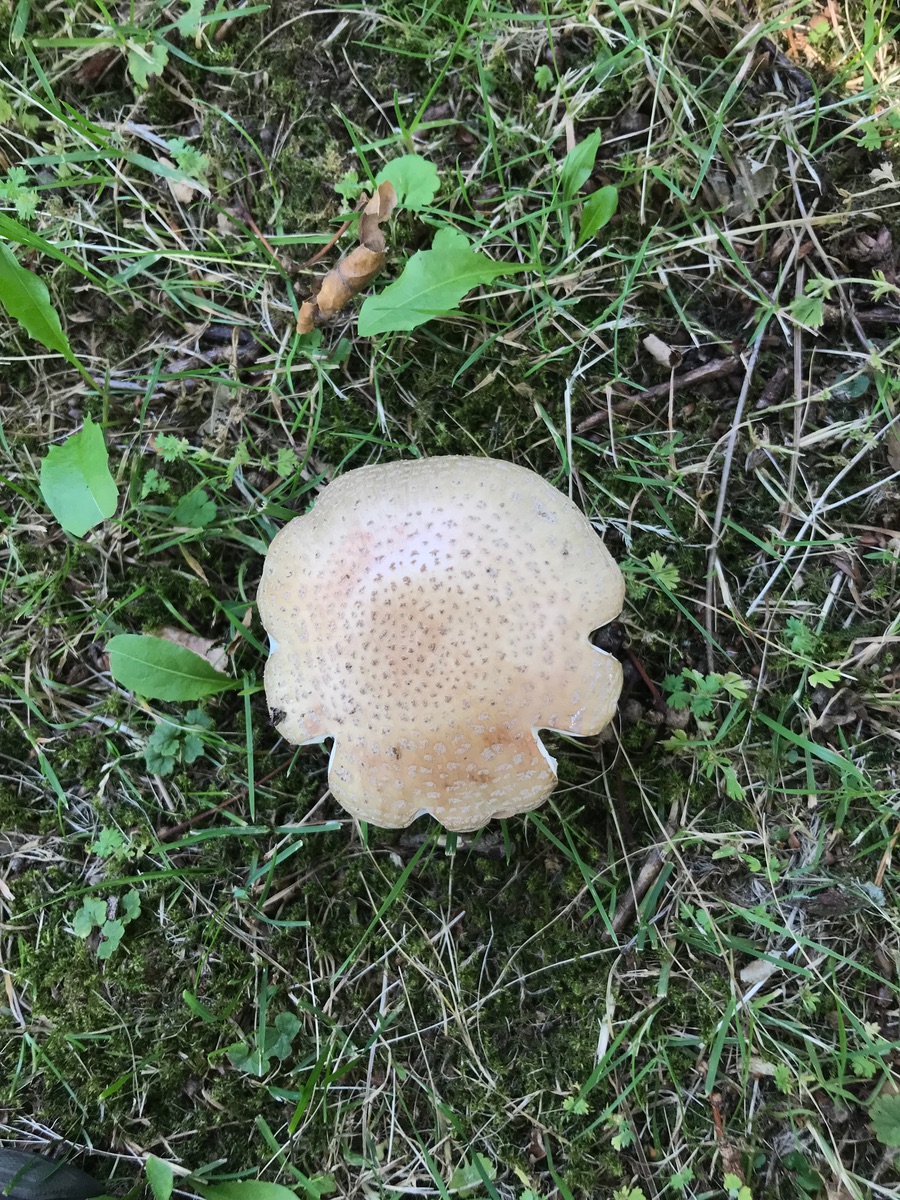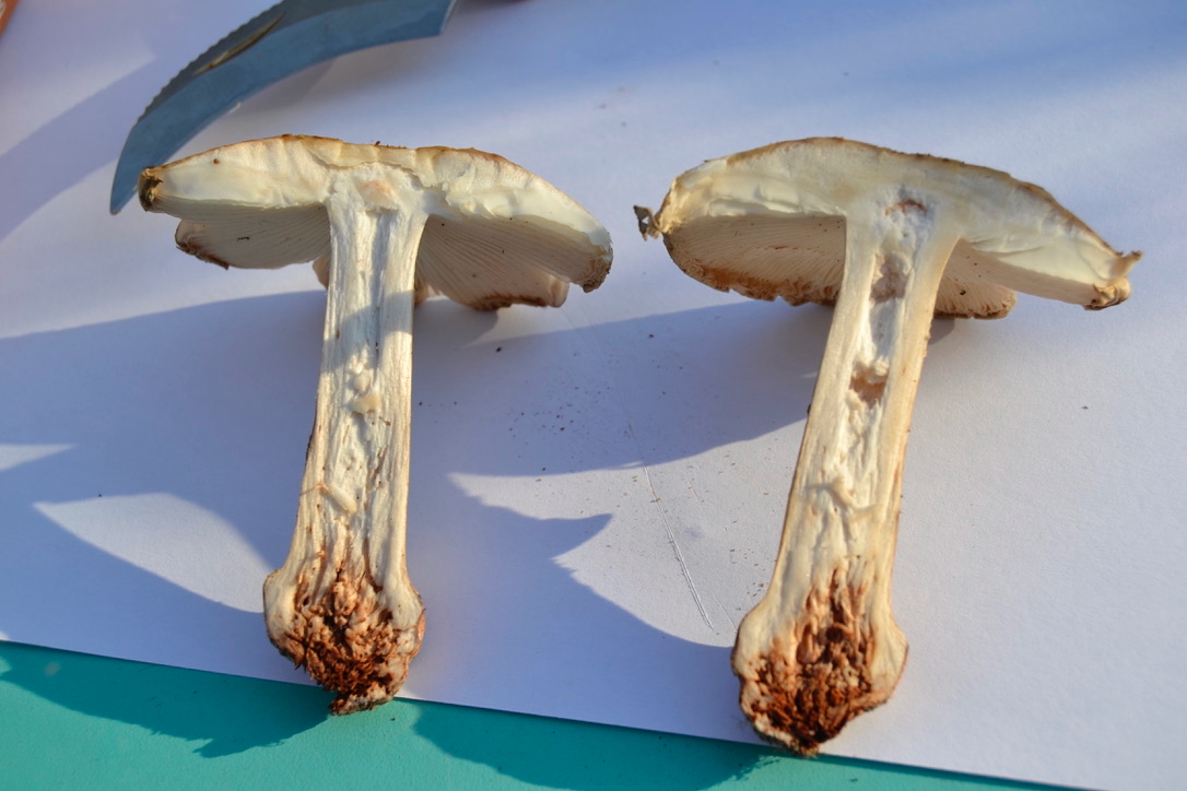 Auf den ersten und zweiten Blick dachte ich: Klar, Perlpilz! Aber die fehlende Rötung, die stark abgesetzte Knolle und der an A. Citrina erinnernde Geruch haben Zweifel aufkommen lassen. Man muss sagen, dass es sehr sehr trocken war und die FK bei 35 Grad direkt in der Sonne standen. Der Muff könnte auch Gammel sein und hören die bei Trockenheit auf zu Röten? Was denkt ihr?