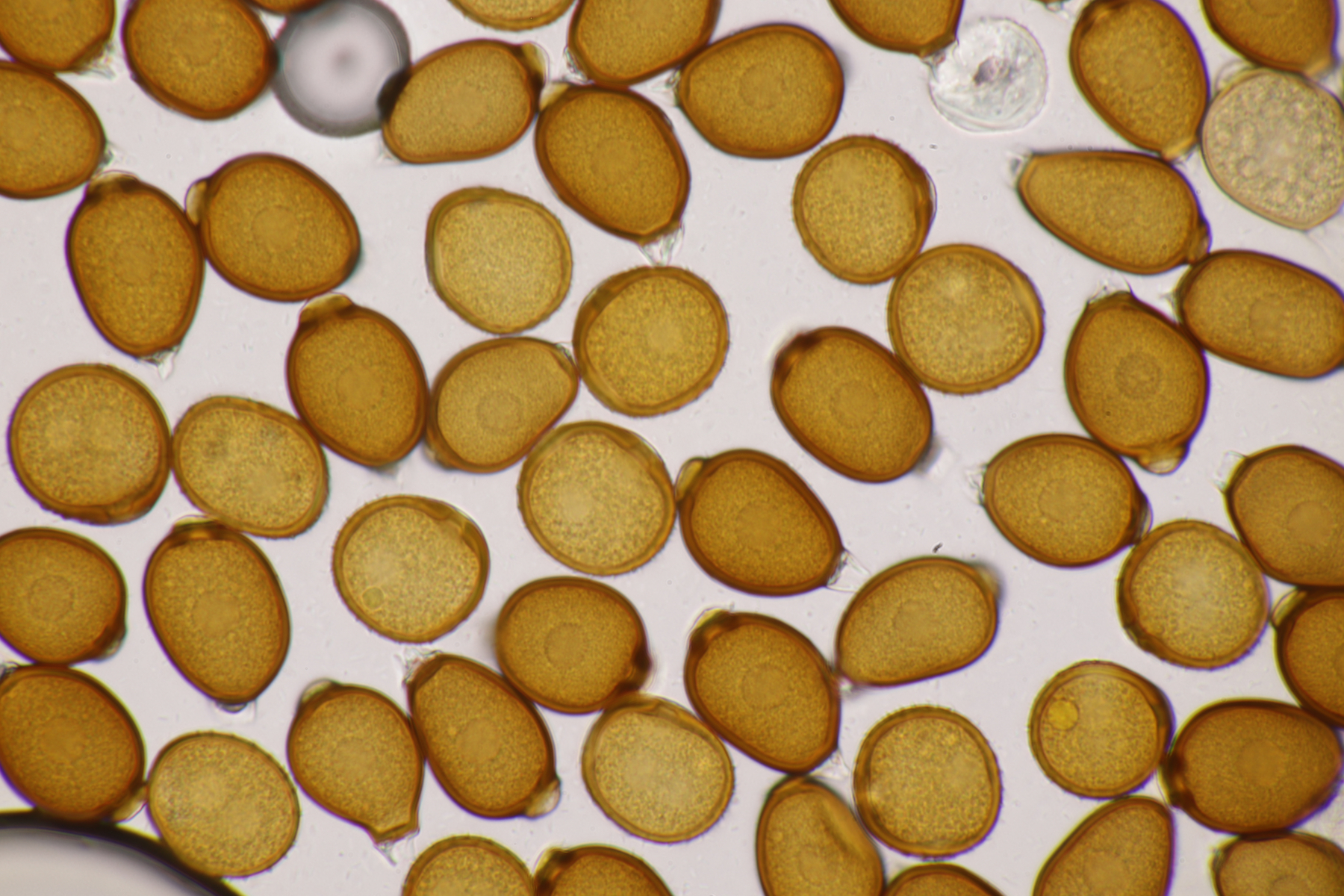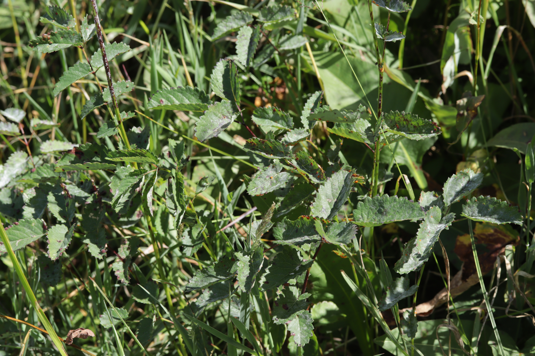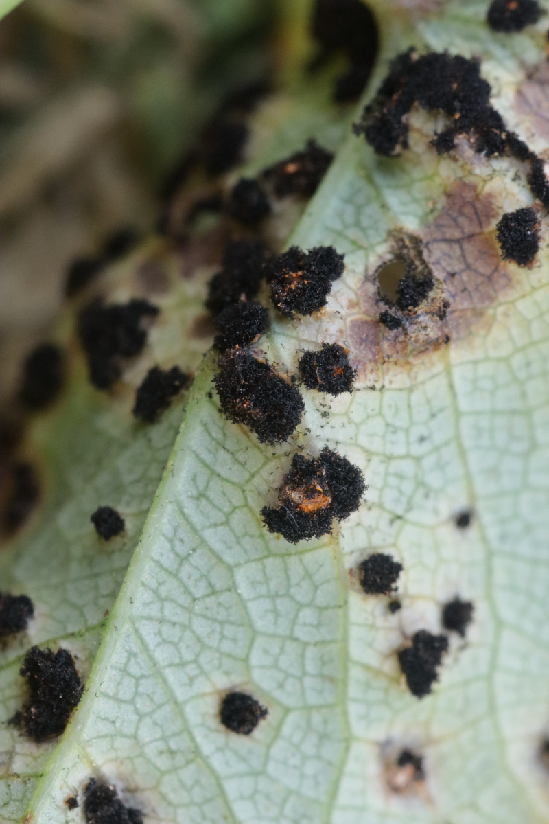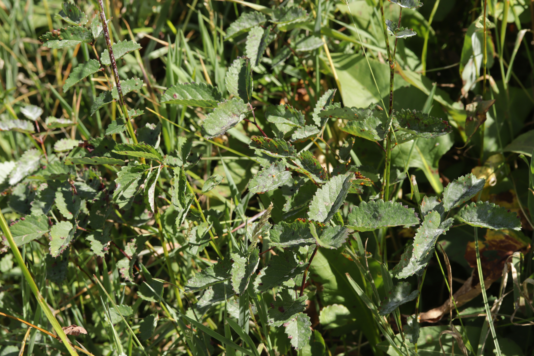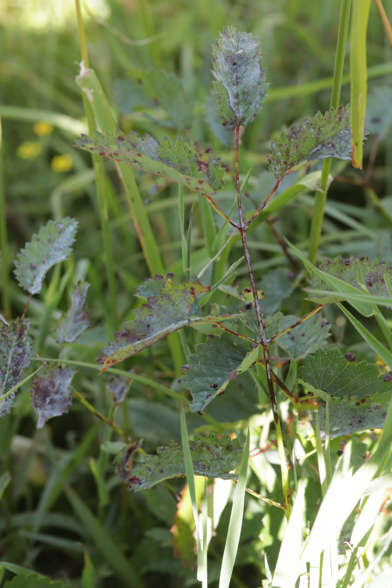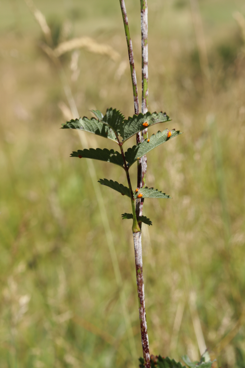 4. Und das Highlight des Tages kurz vor dem Ende der Tour. Ich war schon fast wieder in Winterberg selber, als ich entweder direkt in die Stadt gehen konnte oder erst einen Feldweg entlang. Letztere Option barg allerdings die Gefahr in eine Sackgasse zu laufen (das war dann auch tatsächlich der Fall, aber man konnte zum Glück die Bundesstraße queren und dann auf der anderen Seite Richtung Ort über Feldwege wandern), war allerdings natürlich landschaftlich reizvoller, so daß ich mich für diese Option entschied. Das wurde auch nach 5 Metern direkt belohnt mit Xenodochus carbonarius ex Sanguisorba officinalis. Ich hatte den Pilze ja das erste Mal auf der Kleinpilztagung in Garmisch gefunden, aber hier war er noch mal eine Nummer schöner ausgeprägt und die Teliosporen waren auch noch mal länger. Ganz überraschend kam der Fund allerdings nicht, denn dort in der Gegend ist der Pilz in den späten 60er Jahren mehrfach nachgewiesen worden.