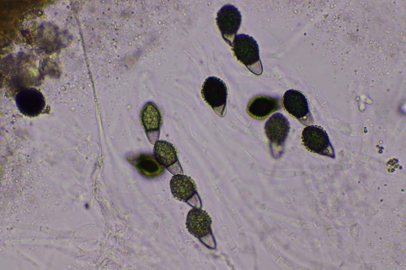 Sporen (16.5) 16.9 - 18.87 (18.9) × (12.3) 12.5 - 14.7 (14.9) µm, komplett mit abgeflachten Warzen besetzt, die 1.2 - 1.7 µm hoch sind. Das Pierrot-Hut-förmige Pedicel hat die Masse (8.1) 8.14 - 10.3 (10.6) × (7.2) 7.5 - 9.3 (9.5) µm