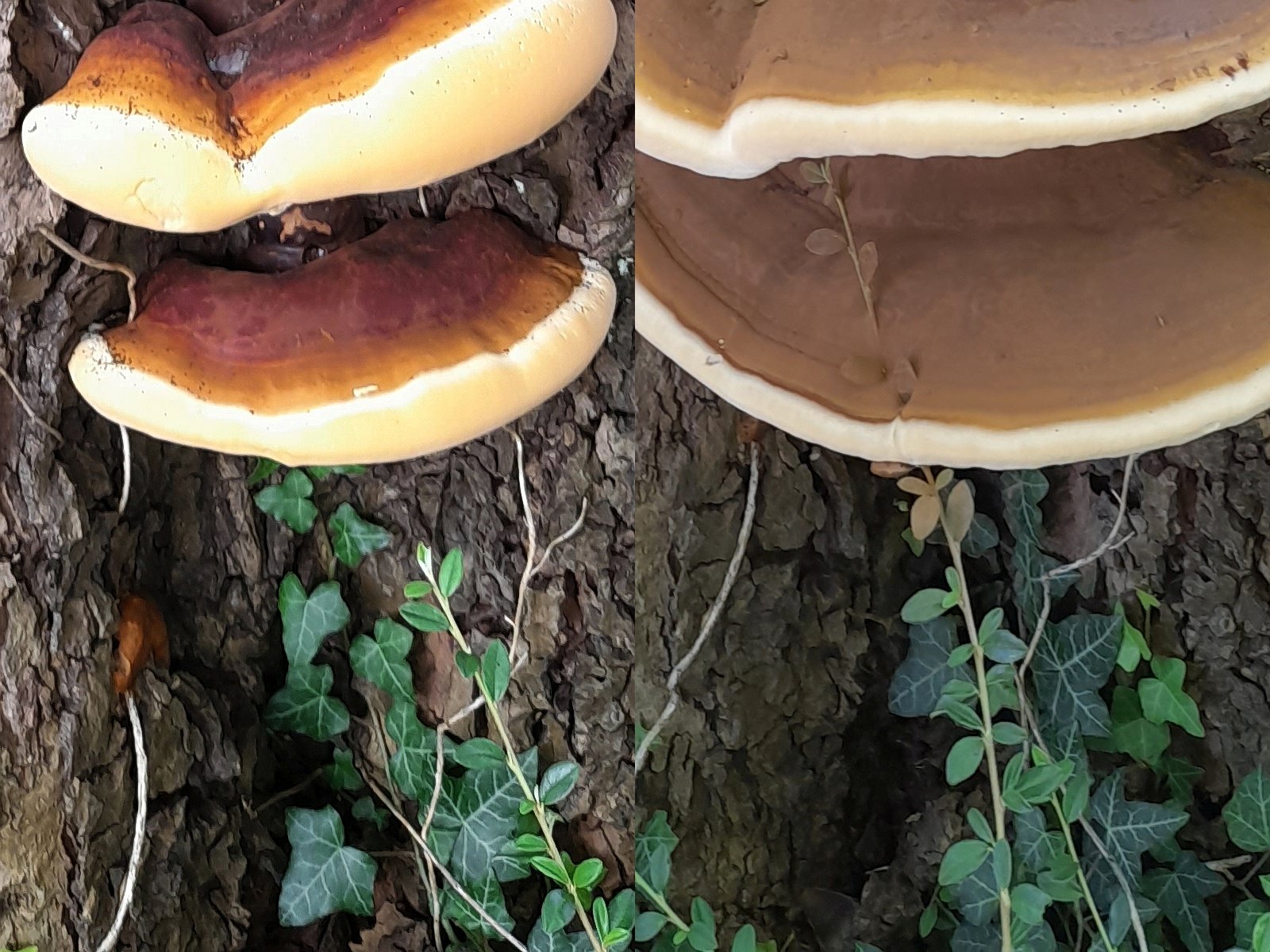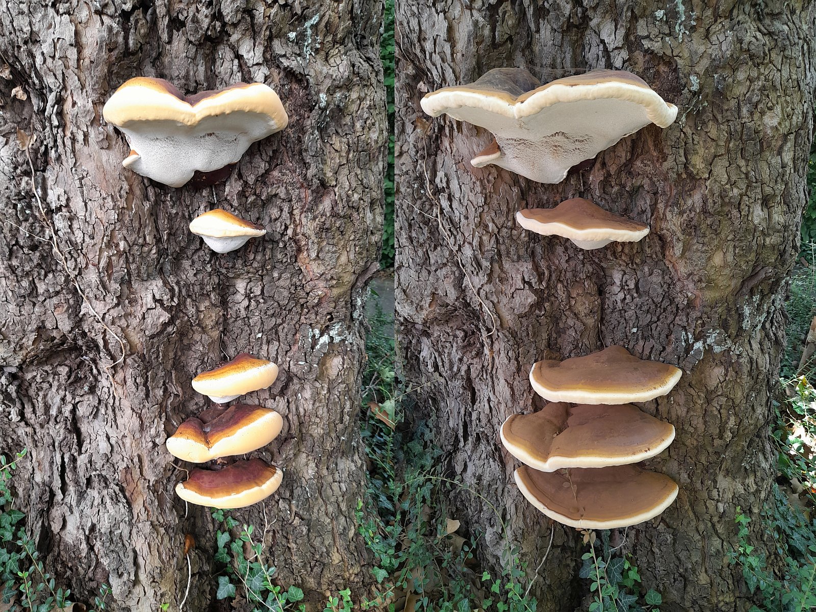 Harziger Lackporling (Ganoderma resinaceum) im Abstand von 14 Tagen verbunden mit der Hoffnung auf weitere Unversehrtheit. Da die Fruchtkörper an einer Platane auf der Straßenseite wuchsen bleiben die Fruchtkörper hoffentlich von Vandalen verschont.