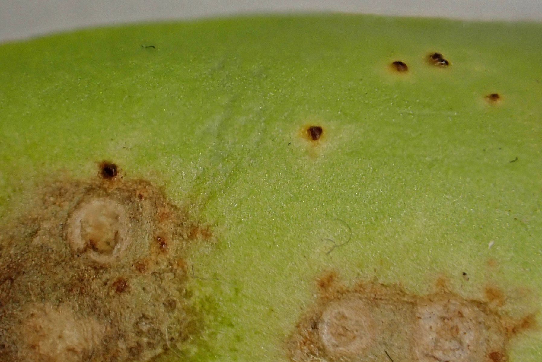 Blattunterseite mit +/- kugeligen, dunkelbraunen "Sporenbehältern", < 500 µm.