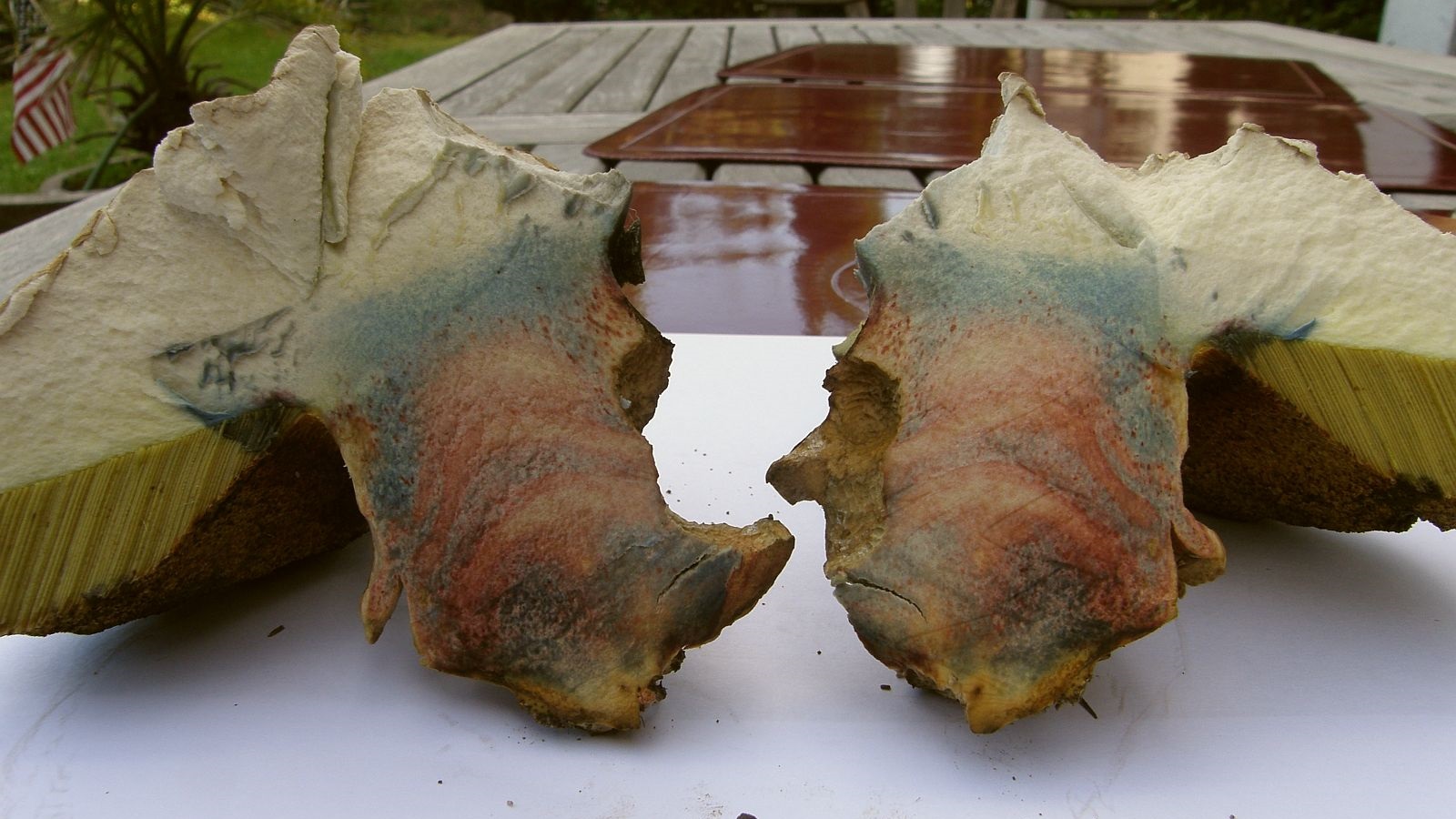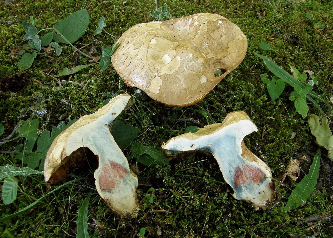 auf dem Bild, wo der Fruchtkörper durchgeschnitten ist, da sieht man doch im unteren Teil zur Stielbasis hin so eine rötliche Verfärbung im Fleisch, zusätzlich zum leichten blau und gelb.