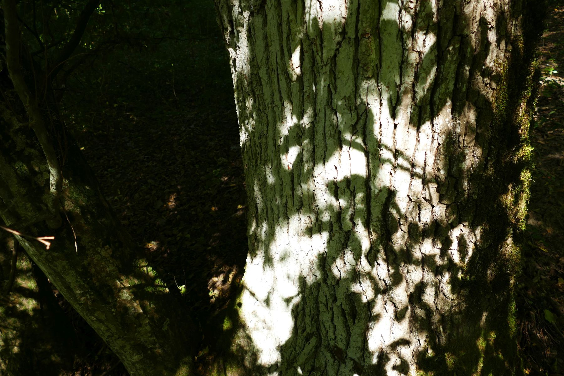 Die Südseite des Eichenstammes ist flächig mit einer silbrig-weißen Flechte überzogen.