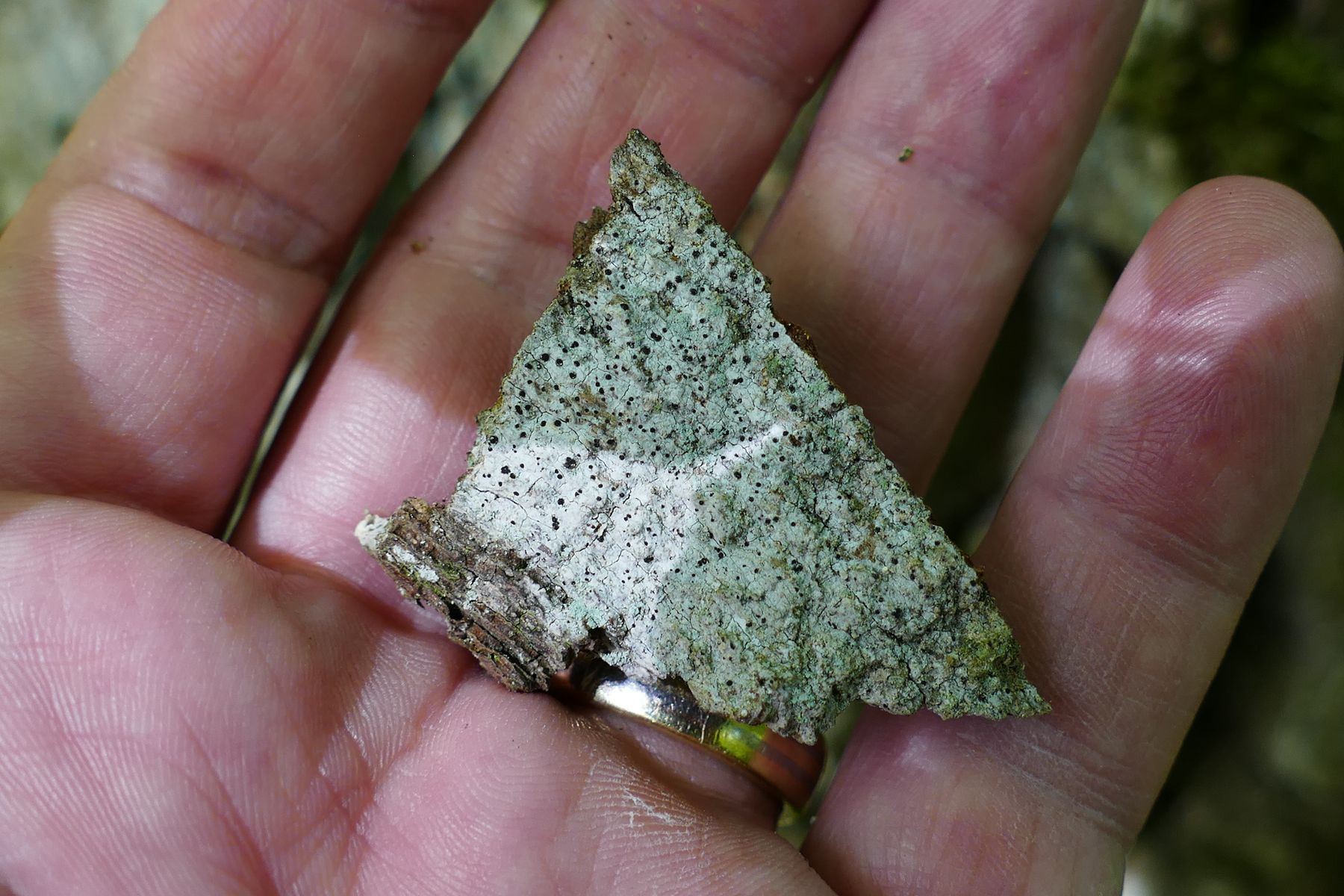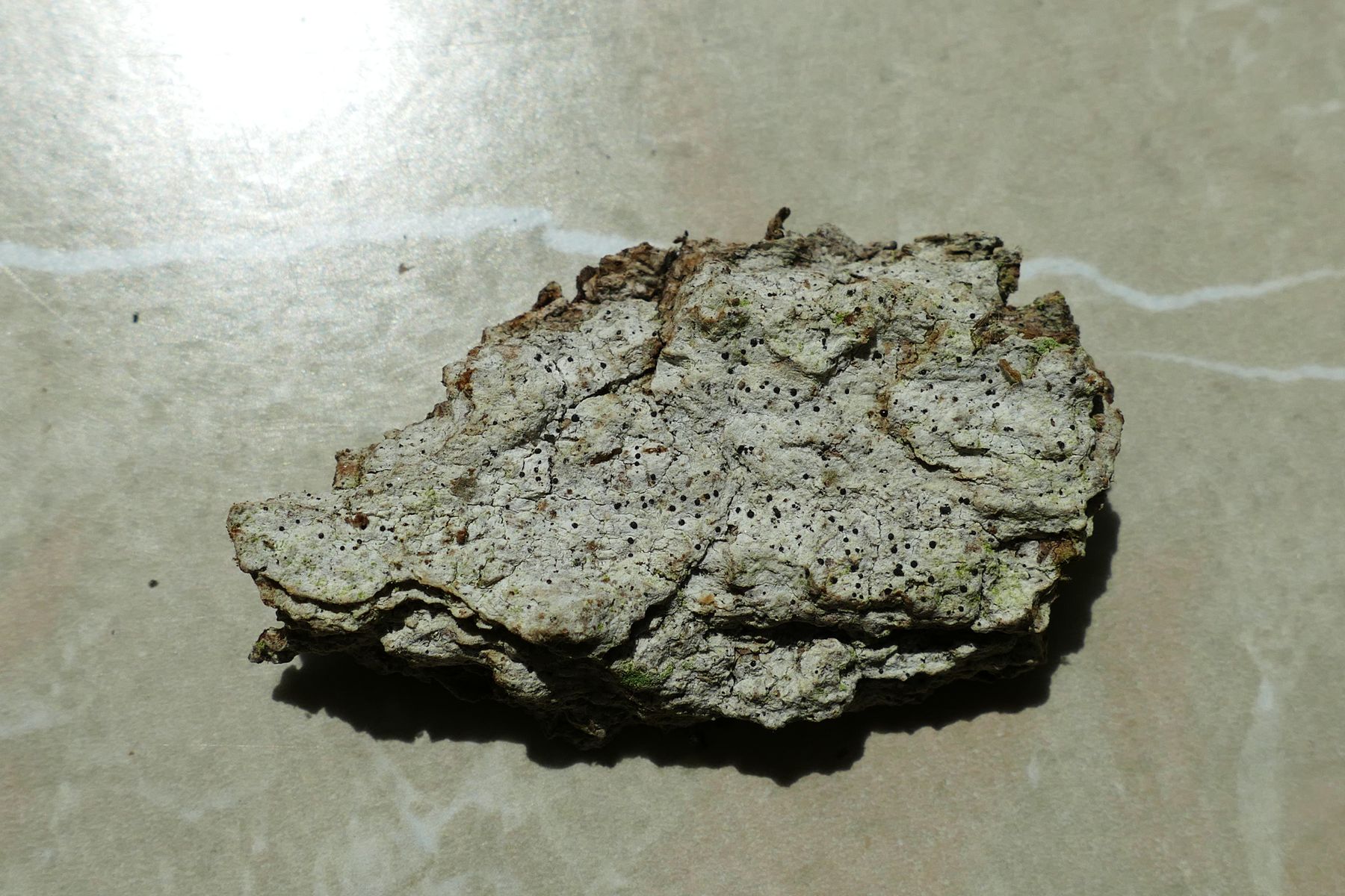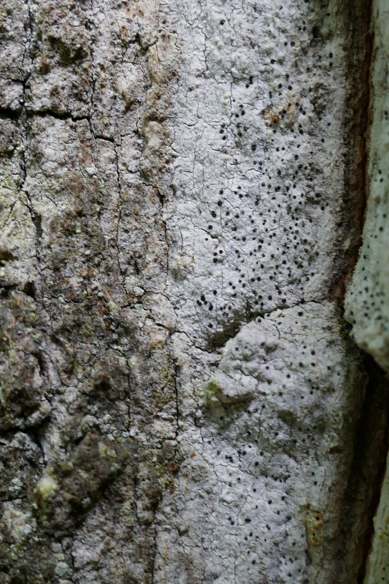 Diesmal habe ich von einer rissigen Eiche eine silbern-weiße Krustenflechte mitgenommen, die den Stamm großflächig überzog.