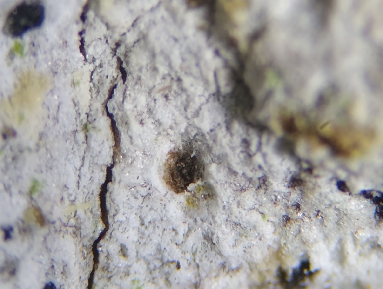 Auf dem weißen Thallus befinden sich auch gelbliche Abschnitte - eventuell ein früher Hinweis auf Trentepholia als Algenpartner.