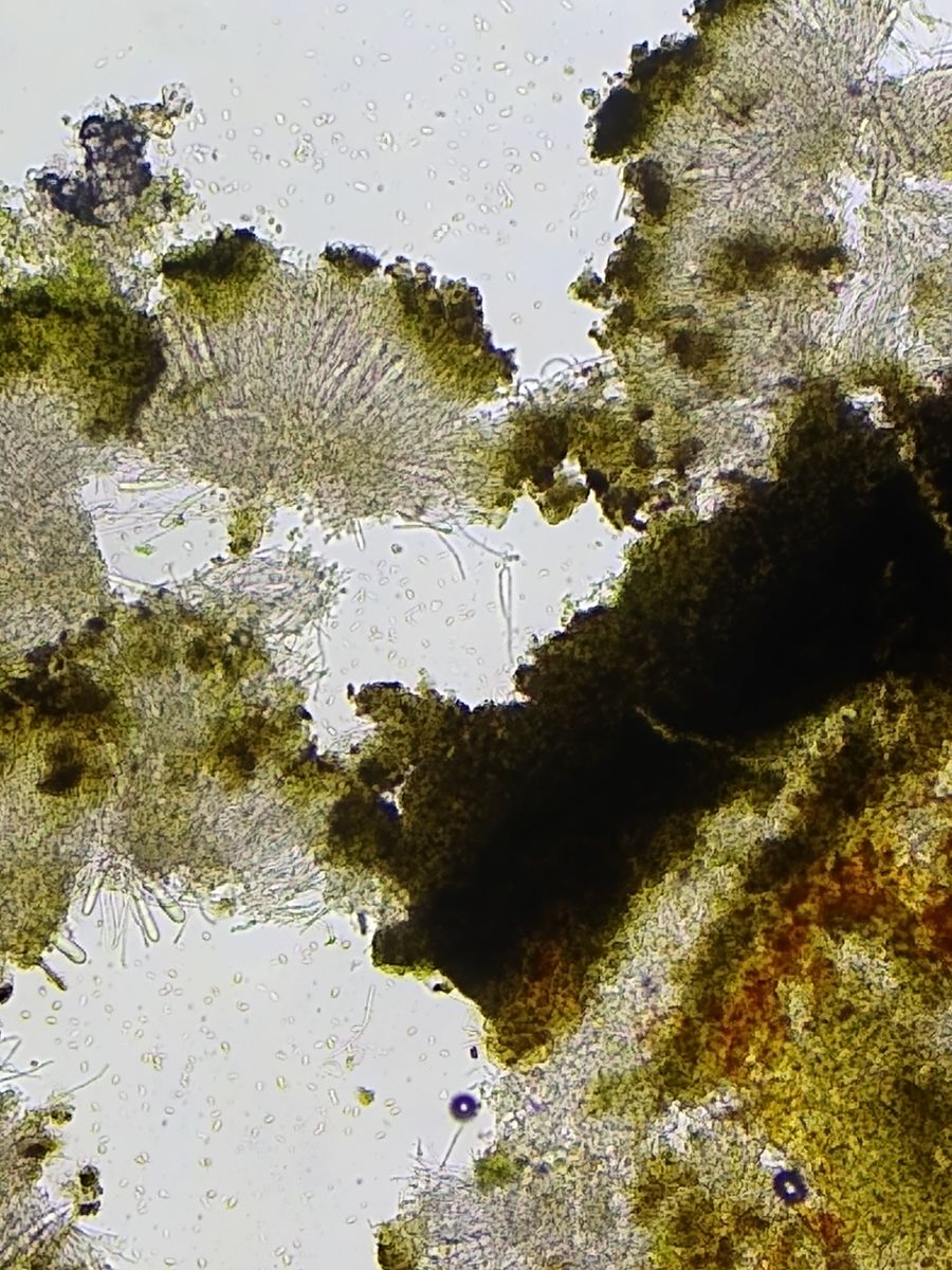 Die gemessene Apotheciengröße von 200-400µm liegt im unteren Überlappungsbereich beider Arten, hilft also nicht wirklich weiter - die Tendenz geht hier eher Richtung B. corticola, da diese die kleineren Apothecien hat.