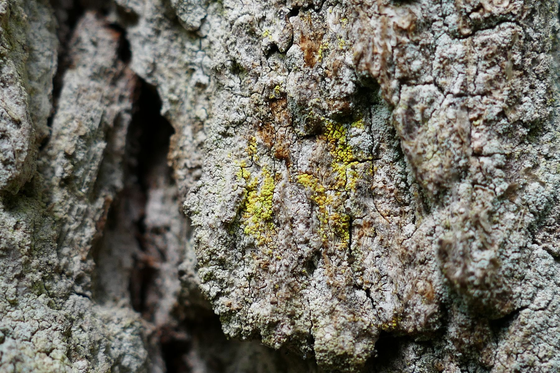 Bild 1 Auffällige gelbe Lager auf der Eichenborke - wenn man's weiß, erkennt man schwarze Fruchtkörperchen (etwas links und unterhalb der Bildmitte)