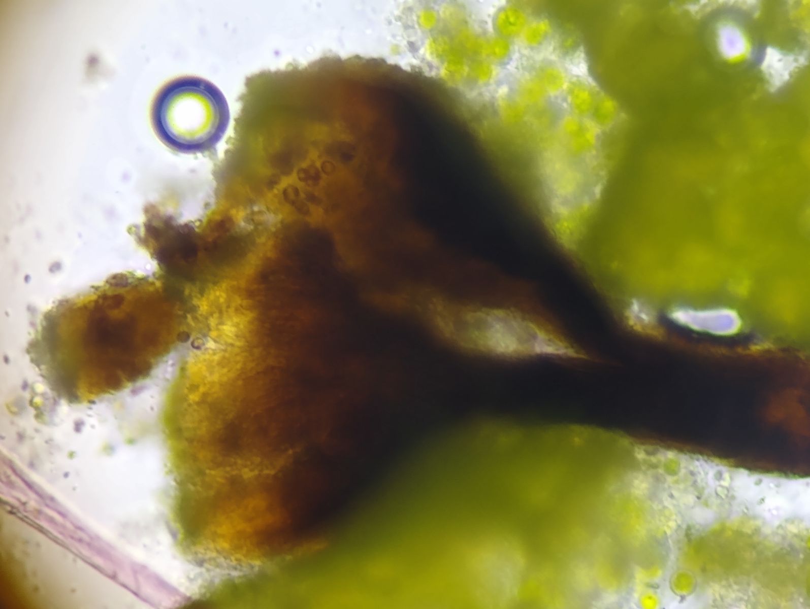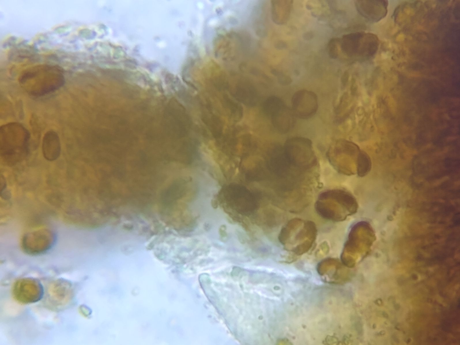 Bild 5 Gequetschter Fruchtkörper mit sporenartigen, braunen Strukturen