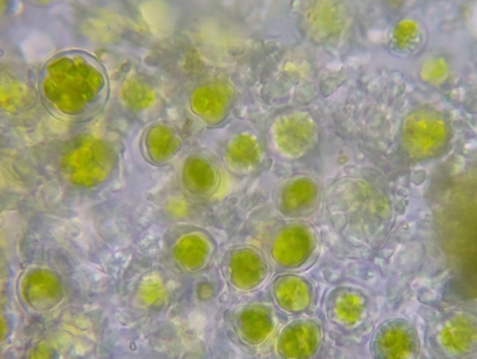 Bild 7 Kugelige, dickwandige Grünalgen mit gelappten Chloroplasten (= verm. Trebouxia)