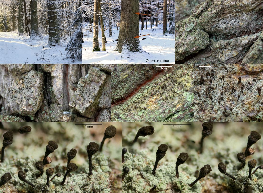 Zurück im Eichen-Hainbuchen-Wald konnte ich heute eine Stecknadelflechte an Eichenborke entdecken.