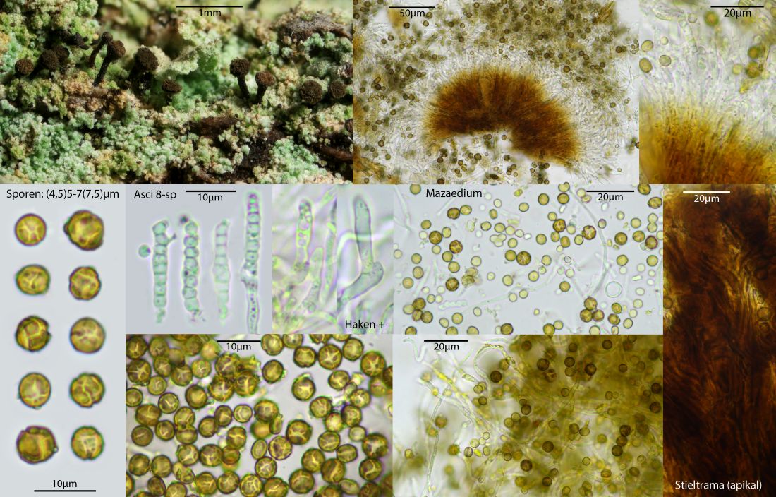 Unter dem Mikroskop (in Auflicht) werden in Seiteanansicht die gelbe Bereifung, die schwarze Färbung der Stiele und das braune Mazaedium der Fruchtkörper erkennbar.