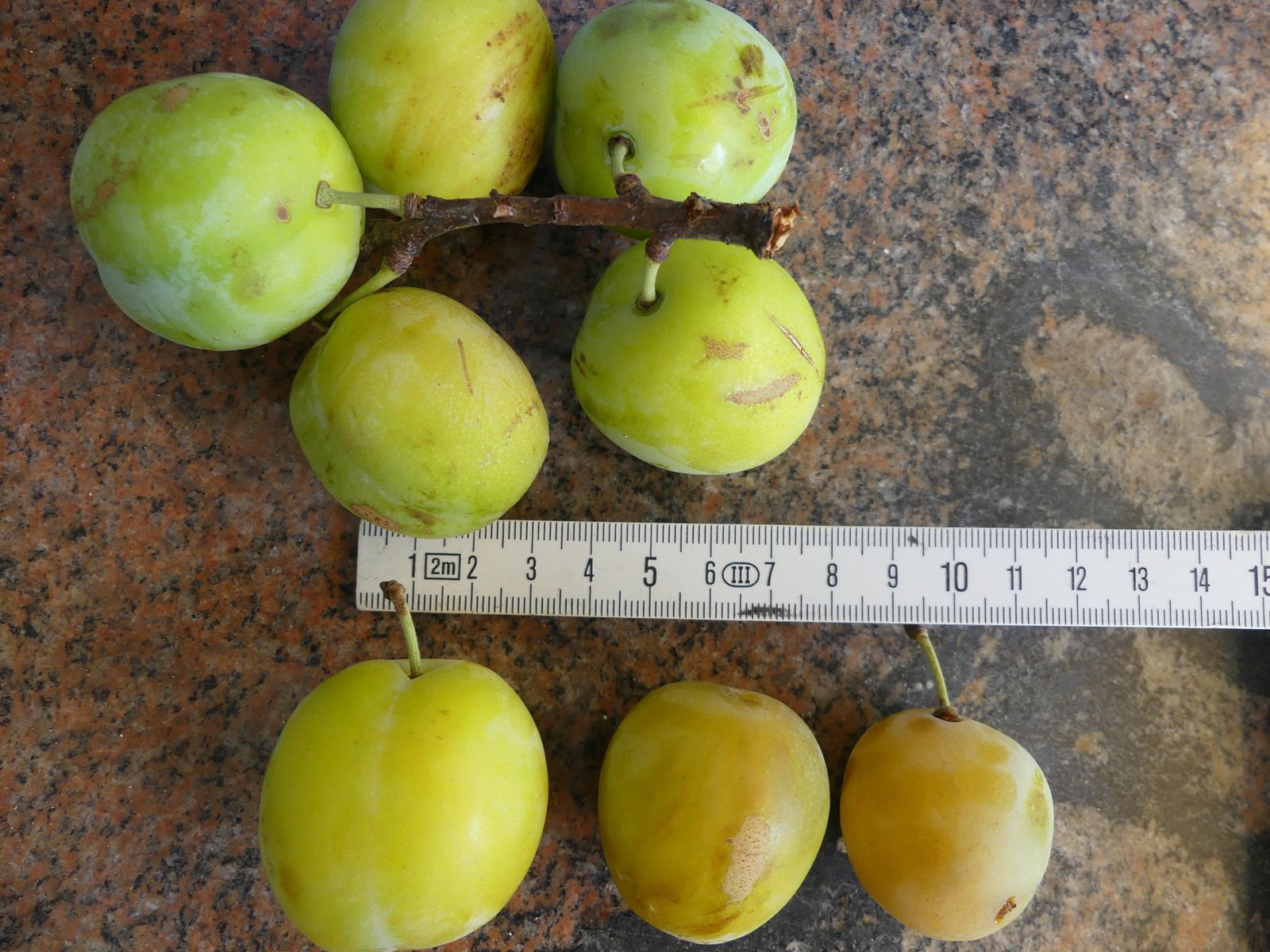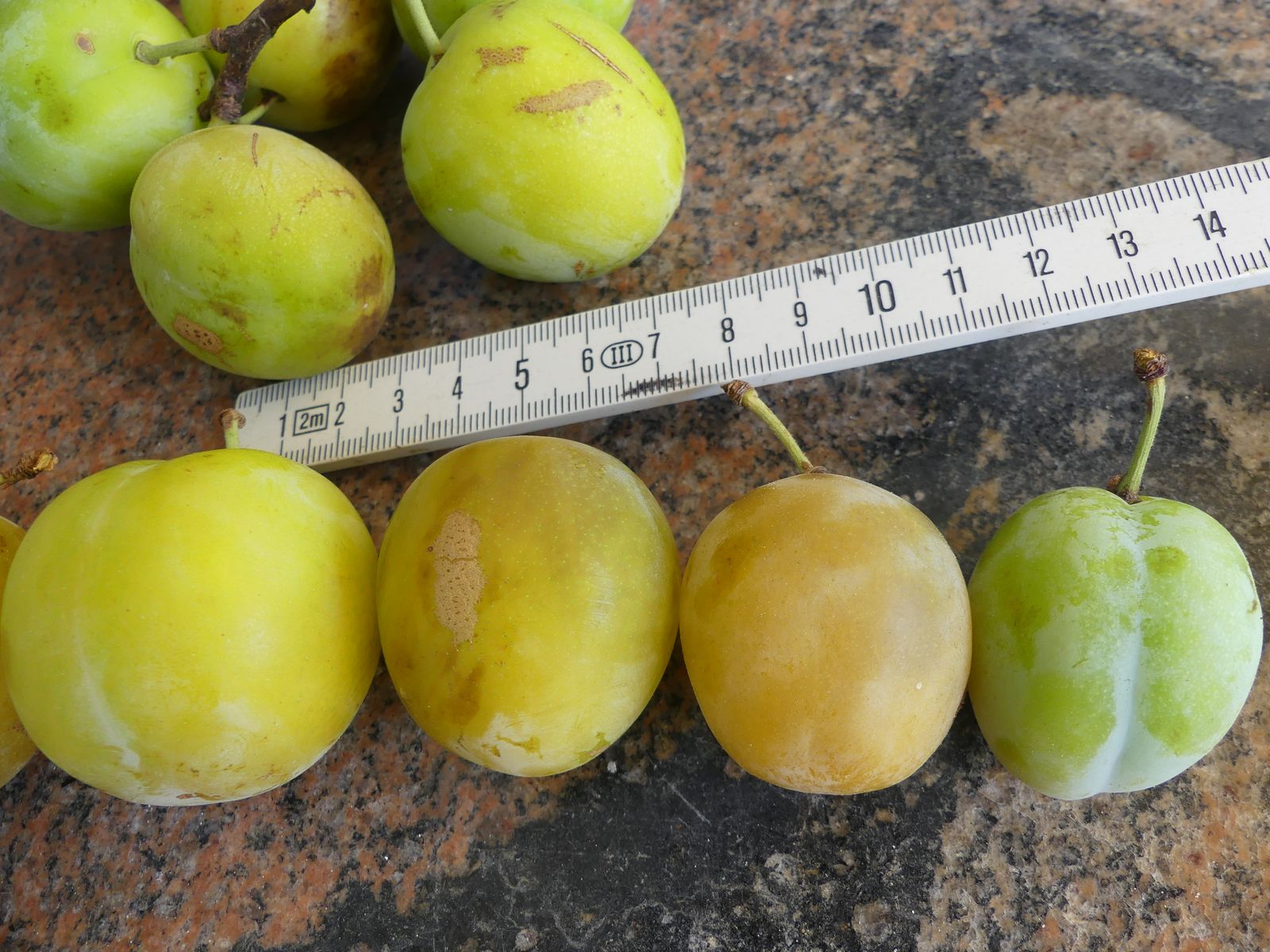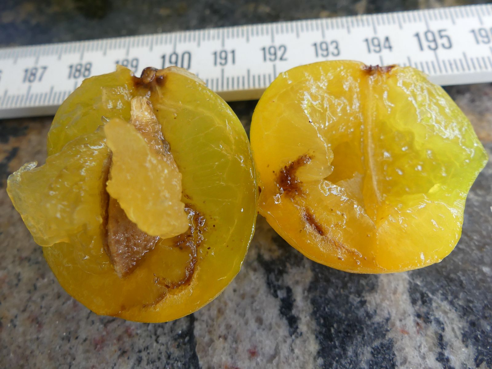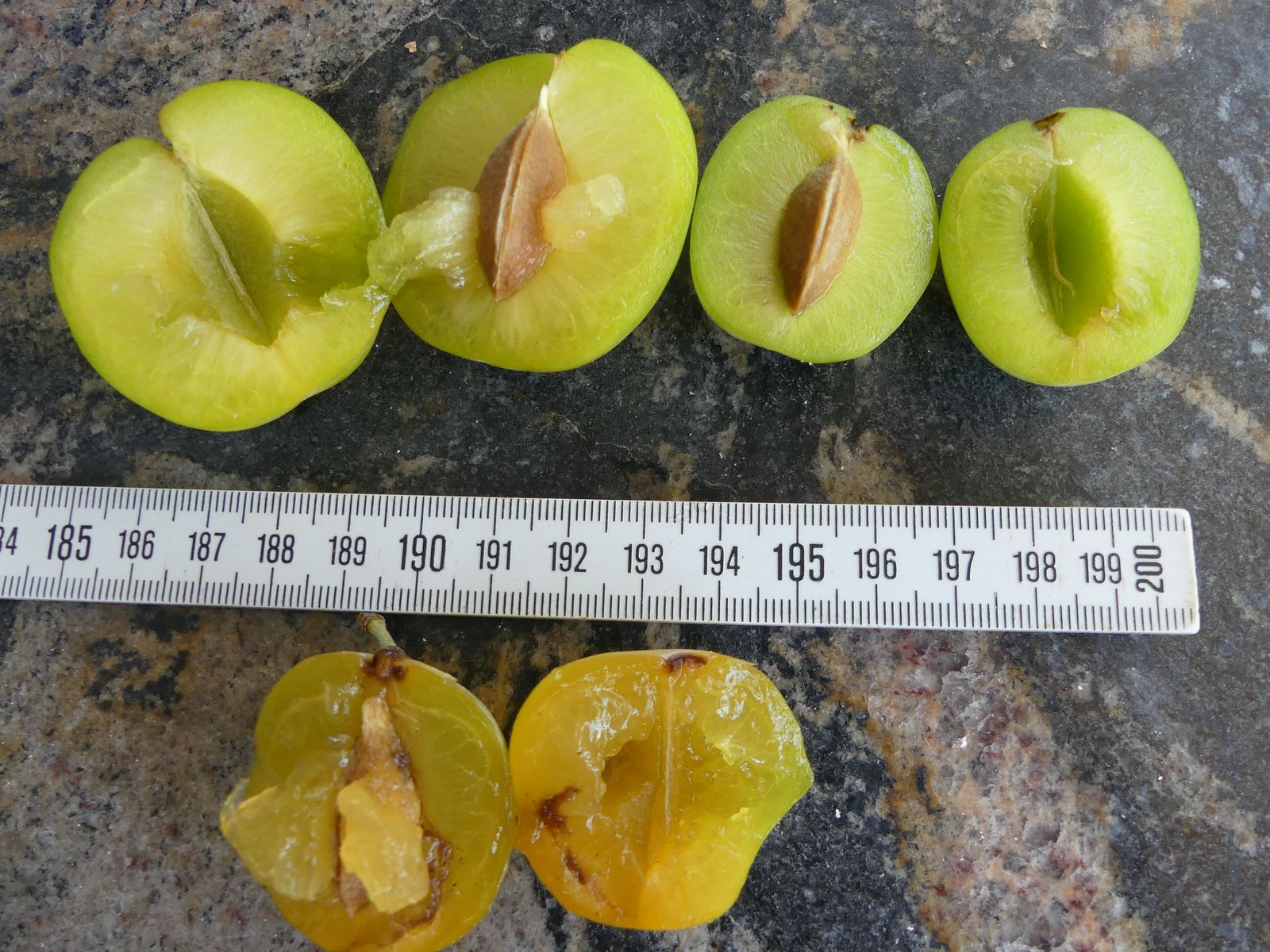 Der Stein löst sich auch bei ausgereiften Früchten nicht so einfach, das Fruchtfleisch ist nur schwach süßlich. Kein Vergleich zu den kleineren aromatischeren Mirabellen.