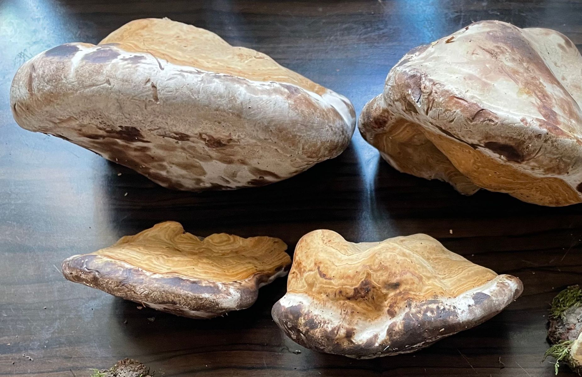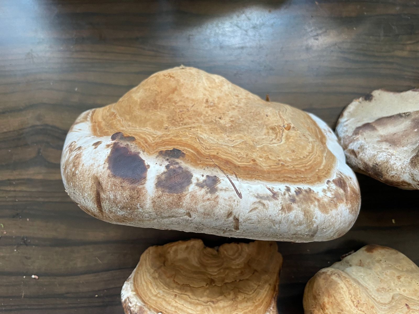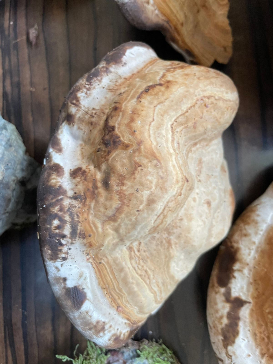 hier nochmal ein Bild aller gefundenen Pilze. Auf diesem wird auch die helle Unterseite des Ersten Pilzes besser sichtbar, welcher noch nicht genau identifiziert ist. Die anderen Pilze kenne ich, Fomitopsis Pinicola etc.