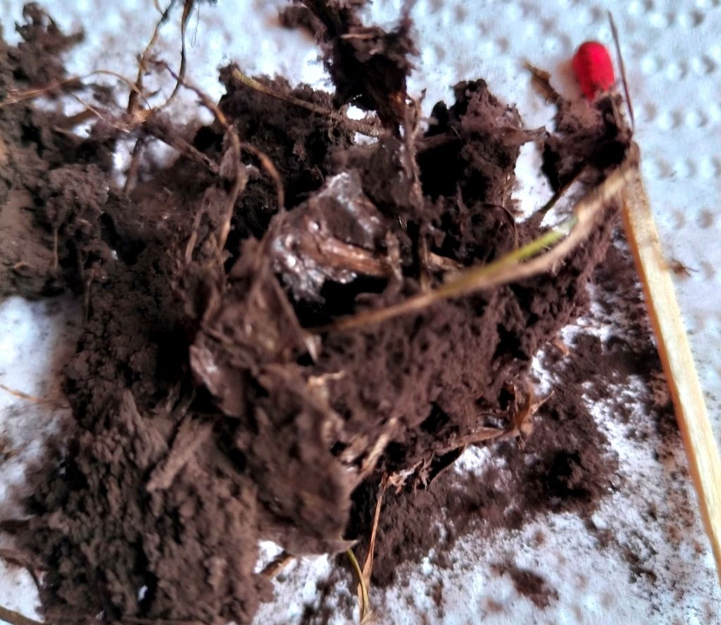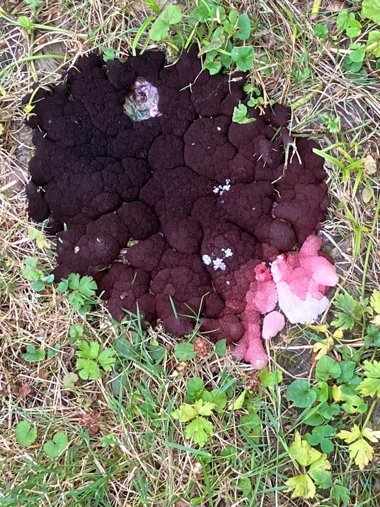 Neben viel Ratlosigkeit kam ein einziger brauchbarer Vorschlag in den Ring, dass es sich um einen (ggf. etwas angetrockneten) Schleimpilz und dabei ggf. um Brefeldia Maxima- den rosaroten Schleimpilz handeln könnte. Der kann wohl neben Holz auch auf Rasen. Hier im Forum wurde dazu ein ähnlicher Fund schon mal diskutiert: Rosaroter Schleimpilz