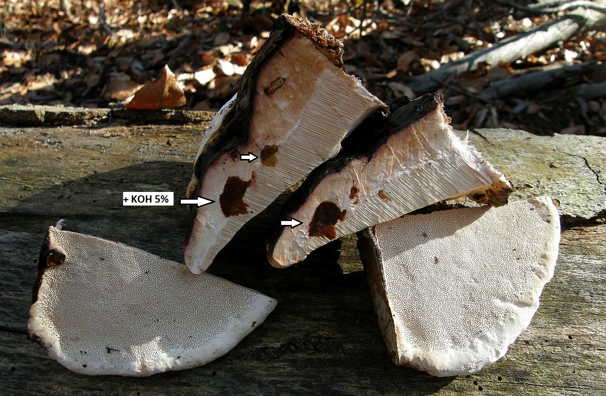 Das ist in der Tat ein komischer Fruchtkörper, wo ich irgendwie doch Zweifel an FomPini habe. Einen Brutzeltest (ob Hutkruste harzhaltig oder nicht) könnte man mal noch veranstalten, aber das funktioniert ja bei FomPini auch nur dann, wenn denn überhaupt eine Kruste ausgebildet ist.Die Reaktion mit KOH (besser 3% - 5% verwenden, höhere Konzentrationen können abweichende Reaktionen zeigen) bei FomPini müsste so aussehen: