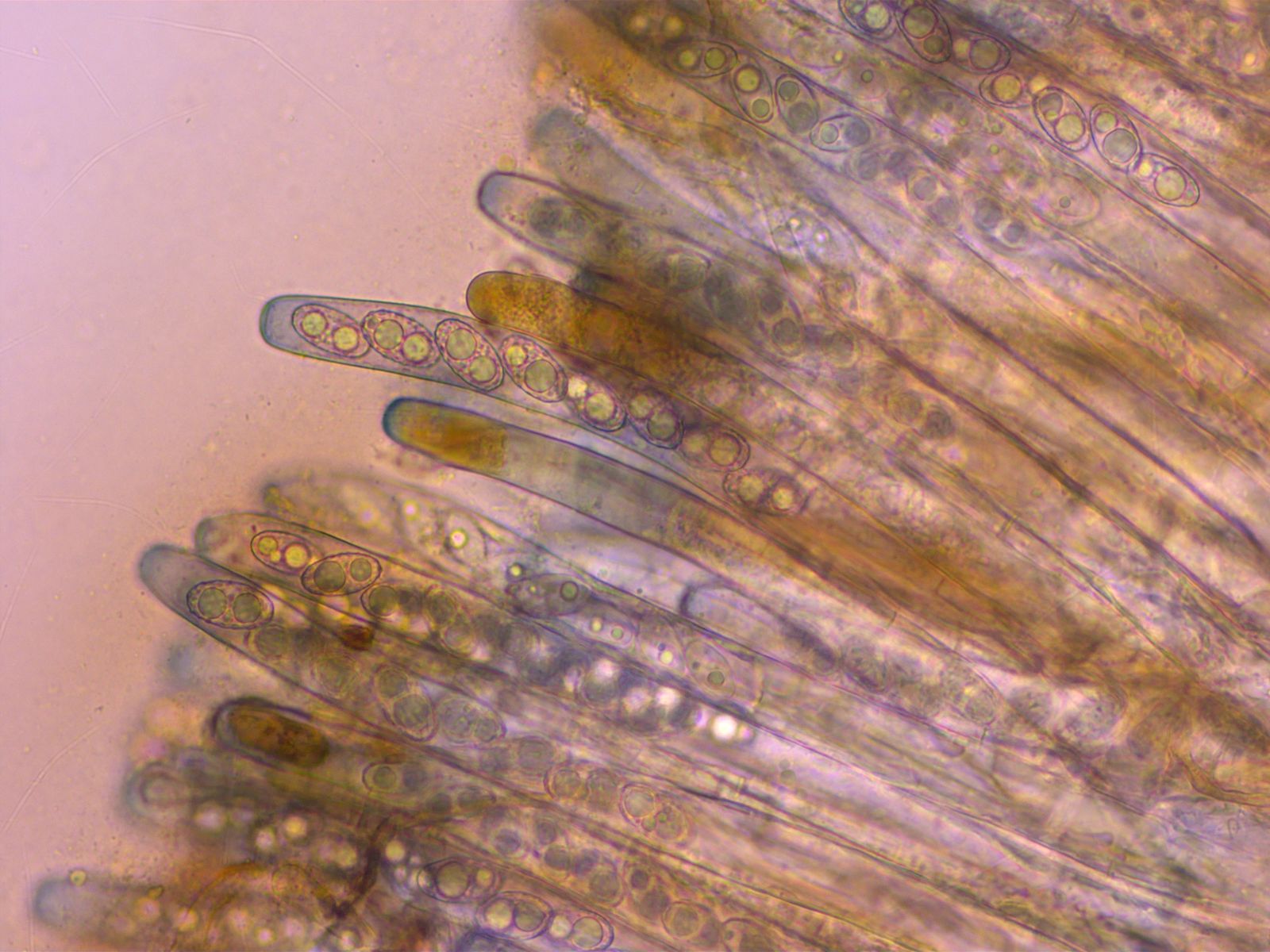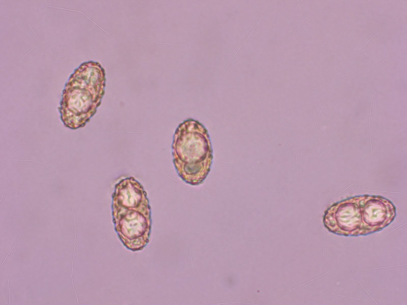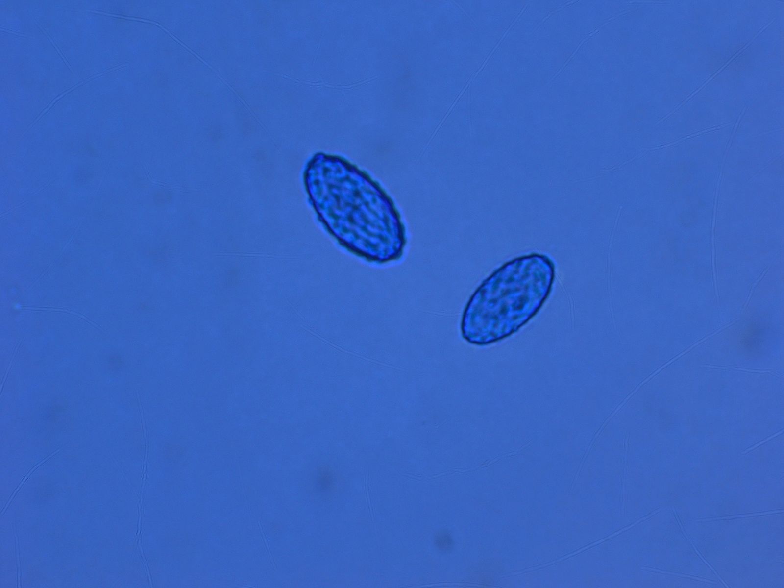 und nochmal in Baumwollblau. Die Sporenoberfläche besteht aus flachen, verbundenen Warzen und Rippen.