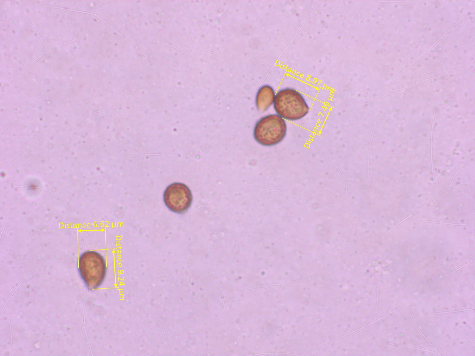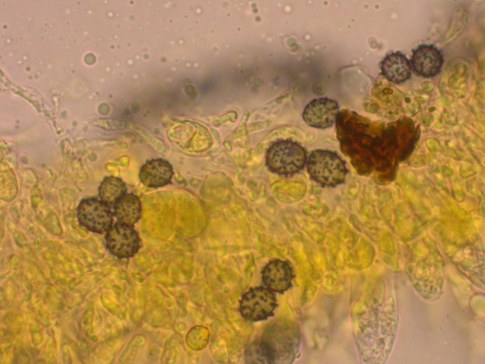 Sporen recht grob warzig, teilweise verbunden, etwa 8-9 x 7-8 µm.