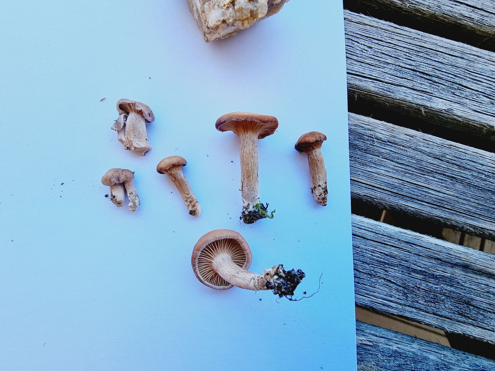Leider ohne Standort-Foto. Ein kleiner clitocyboider Pilz mit bereiftem Rand. Leider verweigerte er mir einen Sporenabwurf.