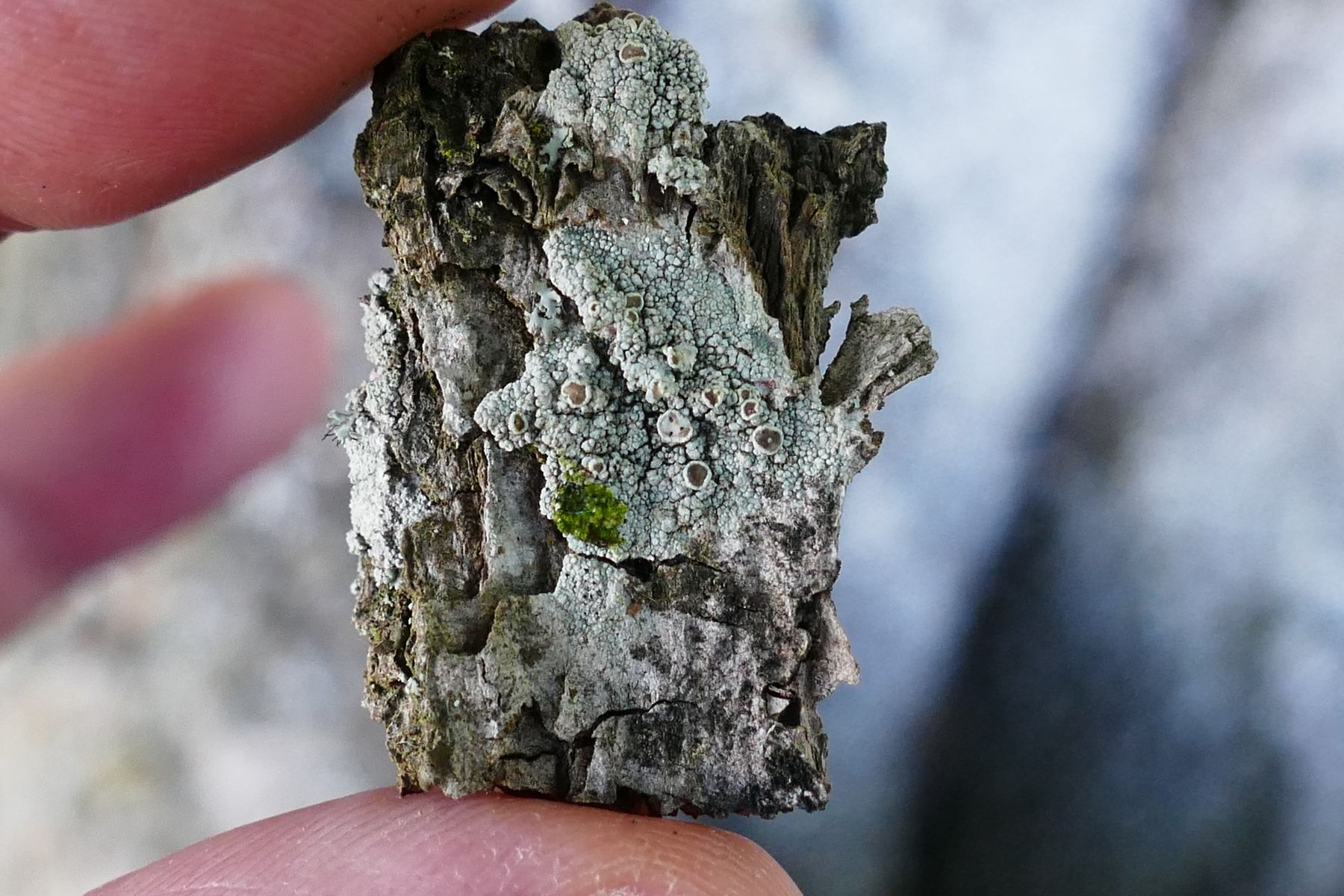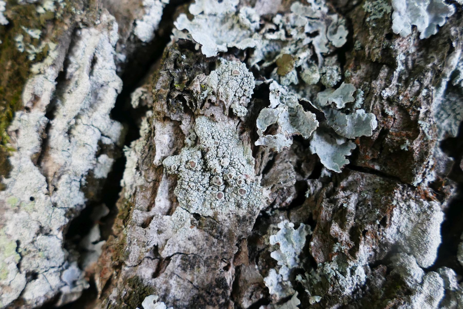 Am Stamm einer alten, sechstämmigen Linde sitzt eine kleine, grauweiße, isidiöse Krustenflechte mit (!) Apothecien.